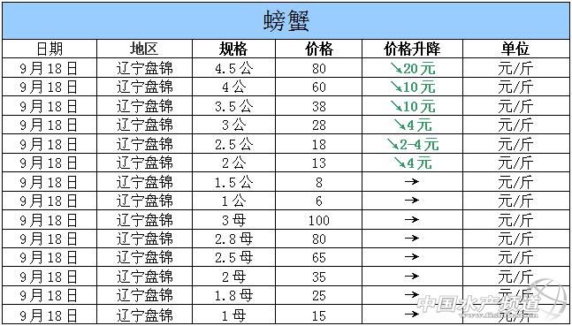 中國水產(chǎn)頻道獨家報道,據(jù)網(wǎng)友提供消息,2015年9月18日遼寧盤錦河蟹價格行情如下: 遼寧盤錦河蟹價格信息由盤錦市雙臺子區(qū)東風(fēng)市場新華街3號流波河蟹商行(電話:18040020068;15942702021;0427—6616465)提供,由于價格波動及訂貨量影響,以上價格為收購價格,實際價格請聯(lián)系電話。 【關(guān)鍵字】:河蟹價格 河蟹行情 河蟹塘頭價 (中國水產(chǎn)頻道水產(chǎn)價格信息共享Q群:245296163,歡迎提供各種水產(chǎn)品一線價格信息。 |