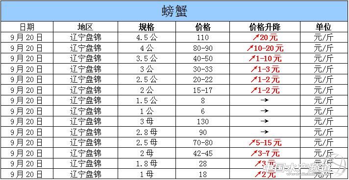 摘要: 2015年9月20日遼寧盤錦河蟹價格行情