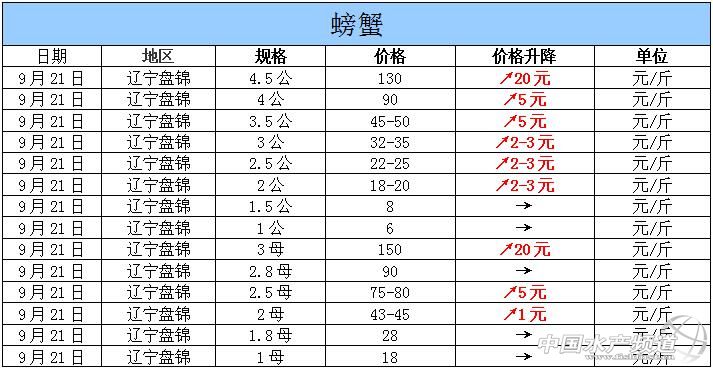 摘要: 2015年9月21日遼寧盤錦河蟹價格行情