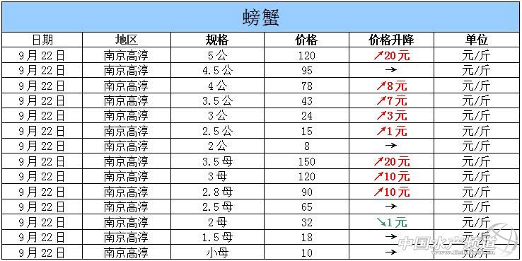 中國水產(chǎn)頻道獨家報道,據(jù)網(wǎng)友提供消息,2015年9月22日江蘇高淳河蟹價格行情如下: 南京高淳河蟹價格信息由南京康旭科技有限公司沈先生(電話:13770896772,網(wǎng)站:http://shop110368651.taobao.com)提供,由于價格波動及訂貨量影響,以上價格為收購價格,實際價格請聯(lián)系電話。 【關(guān)鍵字】:河蟹價格 河蟹行情 河蟹塘頭價 。ㄖ袊水產(chǎn)頻道水產(chǎn)價格信息共享Q群:245296163,歡迎提供各種水產(chǎn)品一線價格信息。 |