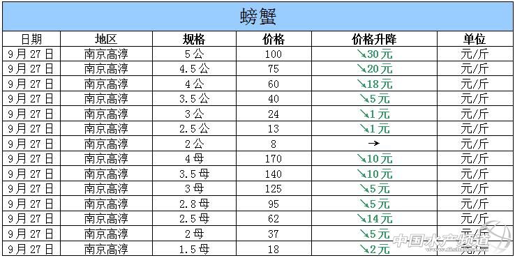 中國(guó)水產(chǎn)頻道獨(dú)家報(bào)道,據(jù)網(wǎng)友提供消息,2015年9月27日江蘇高淳河蟹價(jià)格行情如下: 南京高淳河蟹價(jià)格信息由南京康旭科技有限公司沈先生(電話:13770896772,網(wǎng)站:http://shop110368651.taobao.com)提供,由于價(jià)格波動(dòng)及訂貨量影響,以上價(jià)格為收購(gòu)價(jià)格,實(shí)際價(jià)格請(qǐng)聯(lián)系電話。 【關(guān)鍵字】:河蟹價(jià)格 河蟹行情 河蟹塘頭價(jià) (中國(guó)水產(chǎn)頻道水產(chǎn)價(jià)格信息共享Q群:245296163,歡迎提供各種水產(chǎn)品一線價(jià)格信息。 |