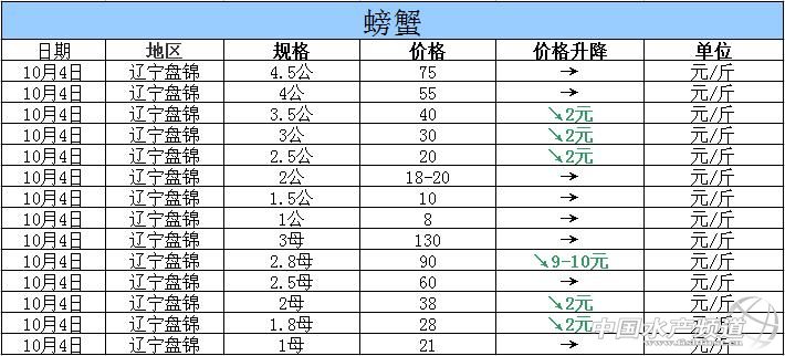 摘要: 2015年10月4日遼寧盤錦河蟹價格行情