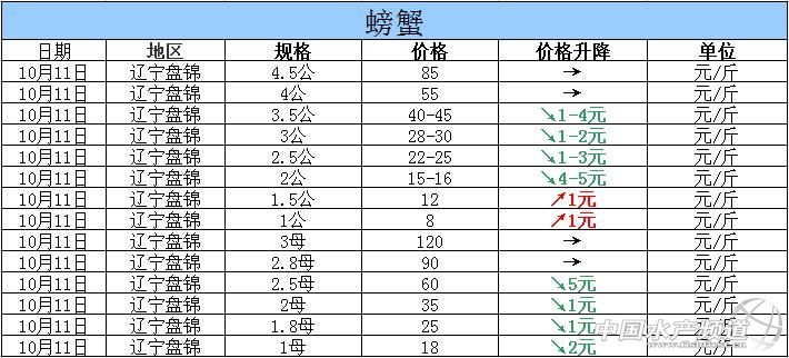 中國(guó)水產(chǎn)頻道獨(dú)家報(bào)道,據(jù)網(wǎng)友提供消息,2015年10月11日遼寧盤錦河蟹價(jià)格行情如下: 遼寧盤錦河蟹價(jià)格信息由盤錦市雙臺(tái)子區(qū)東風(fēng)市場(chǎng)新華街3號(hào)流波河蟹商行(電話:18040020068;15942702021;0427—6616465)提供,由于價(jià)格波動(dòng)及訂貨量影響,以上價(jià)格為收購(gòu)價(jià)格,實(shí)際價(jià)格請(qǐng)聯(lián)系電話。 【關(guān)鍵字】:河蟹價(jià)格 河蟹行情 河蟹塘頭價(jià) (中國(guó)水產(chǎn)頻道水產(chǎn)價(jià)格信息共享Q群:245296163,歡迎提供各種水產(chǎn)品一線價(jià)格信息!) |