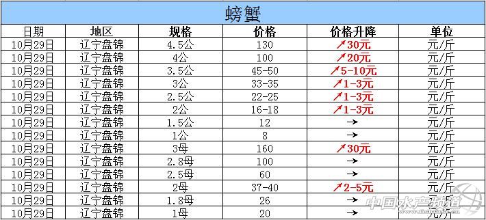摘要: 2015年10月29日遼寧盤錦河蟹價格行情