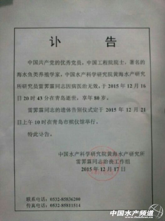 雷霽霖院士 中國水產科學研究院黃海水產研究所發布的訃告 我國著名海水魚類學家、中國水產科學研究院黃海水產研究所研究員、國家鲆鰈類產業技術體系首席科學家、魚類工業化養殖體系奠基人、中國工程院院士、中國大菱鲆之父雷霽霖先生,于2015年12月16日20時43分,因病在青島逝世,享年80歲。
