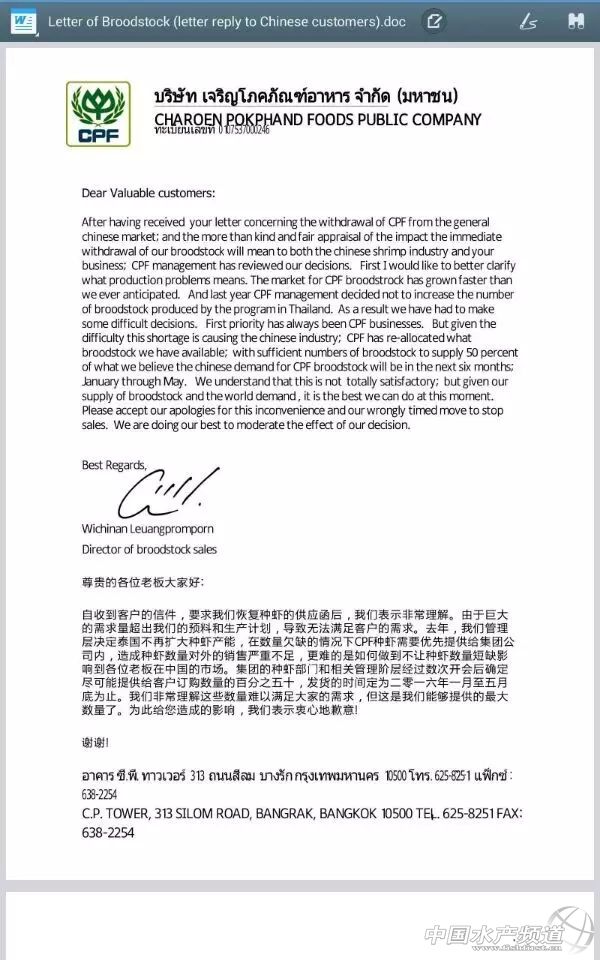文/中國水產(chǎn)頻道 張紅 中國水產(chǎn)頻道獨(dú)家報(bào)道 南美白對(duì)蝦種蝦(圖片來自網(wǎng)絡(luò)) 正大集團(tuán)將恢復(fù)供應(yīng)一半數(shù)量種蝦 2015年12月26日凌晨,海南部分對(duì)蝦種苗企業(yè)和湛江對(duì)蝦種苗協(xié)會(huì)相繼收到正大集團(tuán)發(fā)來的帶有“CPF”企業(yè)商標(biāo)的文件。這是正大集團(tuán)對(duì)湛江對(duì)蝦種苗協(xié)會(huì)還有海南11家苗企聯(lián)合署名提出的“關(guān)于要求正大集團(tuán)恢復(fù)供應(yīng)種蝦的函”的首度正式回應(yīng)。該文件披露,正大集團(tuán)對(duì)先前2016年1月起停止對(duì)外供應(yīng)種蝦的決定作出折中性的讓步:2016年將為客戶恢復(fù)種蝦供應(yīng),但供應(yīng)量只有原來訂單量50%,并且供應(yīng)時(shí)間為2016年1月—5月底,比之前的決定延后了5個(gè)月。 文件具體內(nèi)容如下: 尊貴的各位老板大家好: 自收到客戶的信件,要求我們恢復(fù)種蝦的供應(yīng)函后,我們表示非常理解,由于巨大的需求量超出我們的預(yù)料和生產(chǎn)計(jì)劃,導(dǎo)致無法滿足客戶的需求。去年,我們管理層決定泰國不再擴(kuò)大種蝦產(chǎn)能,在數(shù)量欠缺的情況下CPF種蝦需要優(yōu)先提供給集團(tuán)公司內(nèi),造成種蝦數(shù)量對(duì)外的銷售嚴(yán)重不足,更難的是如何做到不讓種蝦數(shù)量短缺影響到各位老板在中國的市場(chǎng)。集團(tuán)的種蝦部門和相關(guān)管理階層經(jīng)過數(shù)次開會(huì)后確定盡可能提供給客戶訂購數(shù)量的百分之五十,發(fā)貨的時(shí)間定為二零一六年一月至五月底為止。我們非常理解這數(shù)量難以滿足大家的需求,但這是我們能夠提供的最大數(shù)量了。為此給您造成的影響,我們表示衷心地歉意! 正大集團(tuán)回復(fù)海南11個(gè)苗企及湛江對(duì)蝦種苗協(xié)會(huì)的正式文件 部分苗企對(duì)正大回應(yīng)事件的看法 關(guān)于正大集團(tuán)回應(yīng)的結(jié)果,國內(nèi)部分苗企對(duì)其答應(yīng)恢復(fù)供應(yīng)50%親蝦表示基本滿意。因?yàn)樵谕甑纳a(chǎn)旺季,即使是SIS公司也不可能做到100%為苗企提供足夠數(shù)量的種蝦,有時(shí)有些苗企也只能購買到50%的種蝦,所以,如果下一步再與正大集團(tuán)進(jìn)行討價(jià)還價(jià)意義不大。而一般苗企在做訂單計(jì)劃時(shí)的計(jì)劃量比實(shí)際需求量會(huì)多一些。正大集團(tuán)在這件事情上做出了讓步,這是他們對(duì)中國苗企和市場(chǎng)呼聲的回應(yīng),而之前正大集團(tuán)在種蝦斷供的事情上決定是欠考慮的。另外,雖然不知道正大集團(tuán)斷供種蝦是出于何種利益考慮,但如果正大種蝦一年能對(duì)外銷售幾十萬對(duì),讓更多的市場(chǎng)來進(jìn)行反饋和比較,那么對(duì)其種蝦公司的運(yùn)營(yíng)未免不是好事。 由于幾年來國內(nèi)種蝦市場(chǎng)一直是SIS一家獨(dú)大,所以我們歡迎更多種蝦品系進(jìn)入中國,供各苗企進(jìn)行選擇。而作為苗企,則應(yīng)該更多需要注重的是親蝦質(zhì)量而不是數(shù)量。 溫馨提示:關(guān)于“正大種蝦供應(yīng)事件”的事態(tài)進(jìn)展,中國水產(chǎn)頻道將會(huì)進(jìn)行緊密跟蹤和報(bào)道,敬請(qǐng)大家關(guān)注! |
