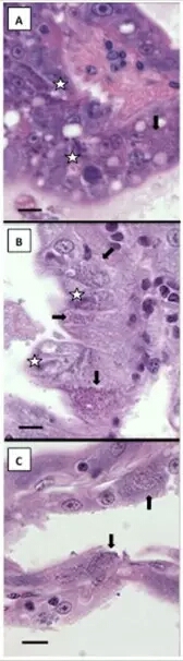 中國水產(chǎn)頻道報道,不同種類的微孢子蟲會對對蝦的肌肉組織,心臟,性腺,鰓,肝胰臟,和神經(jīng)節(jié)產(chǎn)生感染。對蝦微孢子蟲被視為對蝦群體一個潛在威脅,并且會對水產(chǎn)養(yǎng)殖業(yè)的經(jīng)濟效益造成影響。近期,一種叫對蝦腸胞蟲病(EHP)的微孢子被發(fā)現(xiàn)存在于對蝦的肝胰腺中的小管上皮細(xì)胞的細(xì)胞質(zhì)中。在一些東南亞國家,例如越南,泰國,馬來西亞,印度尼西亞,中國和印度的對蝦養(yǎng)殖場已經(jīng)相繼發(fā)現(xiàn)此類微孢子的存在。對蝦腸胞蟲病(EHP)的臨床癥狀還未具體化,但已發(fā)現(xiàn)與對蝦發(fā)育遲緩有關(guān)聯(lián)。 對蝦腸孢蟲病(EHP)的組織病理學(xué) 在檢查被對蝦腸孢蟲。‥HP)感染的來自越南的南美白對蝦(2014)樣本中發(fā)現(xiàn)肝胰腺小管上皮細(xì)胞的細(xì)胞質(zhì)中存在嗜堿細(xì)胞內(nèi)含物(圖1A&1B)。在這實驗中,孢蟲呈現(xiàn)出原形體階段,成熟嗜堿性的孢子也被檢測到。被對蝦腸孢蟲病(EHP)感染的來自文萊的藍對蝦(2006)也發(fā)現(xiàn)微孢子蟲存在于肝胰腺(圖1C)。這些結(jié)果顯示對蝦腸孢蟲病(EHP)早在2006年就存在在亞洲。 對蝦腸孢蟲病的聚合酶鏈反應(yīng) 圖1:對蝦腸孢蟲病(EHP)組織病理學(xué)顯現(xiàn)在感染的對蝦上。(A&B)南美白對蝦的肝臟胰組織,(C)藍對蝦。箭頭代表成熟的孢子;星星代表原形體階段。(比例=25μm.) 我們選擇用來檢測對蝦腸孢蟲。‥HP)的染色體底物包括EHP-510F(5’-GCCTGAGAGATGGCTCCCACG)和EHP-510R(5’-GCGTACTATCCCCAGAGCCCG)。用已經(jīng)受感染的對蝦DNA提取物實施聚合酶鏈反應(yīng)(PCR)。結(jié)果顯示這個聚合酶鏈反應(yīng)能夠檢測出已受感染的對蝦(圖2,1-3行);染病對蝦的排泄物以及水質(zhì)樣本均被檢測出感染對蝦腸孢蟲(EHP)(圖2,4-5行)。同時我們也檢測了另外兩種寄生蟲病原體:阿米巴蟲和蝦白肉病微孢子蟲,然而這些對蝦腸孢蟲。‥HP)底物并沒有與該兩種病蟲發(fā)生交叉反應(yīng)(圖2,6-7行)。 圖4.用地高辛標(biāo)記法標(biāo)記的對蝦腸孢蟲病(EHP)探針在對連續(xù)部位進行原位雜交。深藍色沉淀物表示對蝦腸孢蟲病(EHP)的出現(xiàn)(A)用對蝦腸孢蟲病(EHP)探針對南美白對蝦(越南)進行原位雜交;(B)藍對蝦(文萊);(C)斑節(jié)對蝦表現(xiàn)出了白肉病癥狀(馬達加斯加),插入圖片(D):使用Pereziapenaei探針的原位雜交。比例條=25μm。 令人意外的是,我們從4/9的冷凍鹵蟲生物樣本中檢測出對蝦腸孢蟲病(EHP)(圖2,9行,一個非常具有代表性的樣本)。在這些對對蝦腸孢蟲病(EHP)呈陽性的樣本中,18SrRNA基因被擴充和重新排列。這個被修改的序列與來自越南的對蝦腸孢蟲病樣本有99.9%的相似,也就是說鹵蟲中所帶有的對蝦腸孢蟲病(EHP)很可能源自東南亞。 對蝦腸孢蟲病傳播的研究 以上三個生物測定均使用來自泰國的已感染對蝦腸孢蟲病的對蝦樣本。在第一個生物測定(共棲組)中,染病對蝦被轉(zhuǎn)移到實驗缸中與用高彈體標(biāo)記的無特定病原體的對蝦一起生活。35天后,無特定病原體的對蝦感染對蝦腸孢蟲病原(圖3A)。在第二個生物測定(水生感染組)中,用曾飼養(yǎng)過染病對蝦的水體轉(zhuǎn)移到無特定病原體的對蝦實驗缸中。42天以后,無特定病原體的對蝦依舊沒有感染病原(圖3A)。在第三個生物測定中,用染病對蝦的肝胰腺喂養(yǎng)無特定病原體的對蝦,每隔五天用聚合酶鏈反應(yīng)(PCR)分析樣本;15天后,無特定病原體的對蝦感染病原(圖3B)。實驗結(jié)果顯示,對蝦腸孢蟲病(EHP)可以通過嗜食同類傳播。 原位雜交(ISH) 通過用地高辛標(biāo)記法標(biāo)記的對蝦腸孢蟲病進行原位雜交,染病的南美白對蝦(圖4A)和藍對蝦(圖4B)顯示微孢子(嗜堿性的內(nèi)含物)存在于肝胰腺小管的上皮細(xì)胞中。實驗中的探針具有非常高的識別敏銳性,在已感染蝦白肉病的斑節(jié)對蝦中,該探針無任何反應(yīng)顯示(圖4C)。 結(jié)語 圖2.對蝦腸孢蟲病聚合酶鏈反應(yīng)(PCR)檢測對蝦腸孢蟲。‥HP)。M:1kb以上的階梯型分子量標(biāo)準(zhǔn)。從越南收集來的南美白對蝦樣本(第一行,2014年樣本;第二行,2015年樣本)和來自泰國(3-5行,無特定病原體對蝦,排泄物和水),感染白肉病的斑節(jié)對蝦(第六行),感染阿米巴蟲的南美白對蝦(第七行),無特定病原體的南美白對蝦(第八行),鹵蟲生物樣本(第九行),無操作對照組(第十行)。 對蝦腸孢蟲病(EHP)在養(yǎng)殖對蝦中的傳播可能還會繼續(xù),需要通過建立有效的方法來監(jiān)控這種寄生蟲的發(fā)病和傳播。所以通過用敏銳的分子生物學(xué)方法去檢測對蝦,活餌料和蝦塘環(huán)境的對蝦腸孢蟲病(EHP)會非常有效。感染對蝦腸孢蟲病(EHP)的對蝦通常不能被肉眼識別,因為EHP不會呈現(xiàn)臨床癥狀。本研究表明基于聚合酶鏈反應(yīng)(PCR)和原位雜交(ISH)的檢測方法和診斷步驟具有具體性和靈敏性,可作為有效的常規(guī)診斷方法去檢測對蝦養(yǎng)殖群體,池塘環(huán)境和對蝦產(chǎn)品。 圖3:聚合酶鏈反應(yīng)生物檢測1,生物檢測2,以及shengwujiance3的肝胰腺樣本。(A)35天后檢測出共棲組存在EHP,但是不能檢測到水生感染組。(B)15天后,EHP在(嗜食同類)被檢測到。 相關(guān)鏈接: 世界頂級專家解讀對蝦肝腸胞蟲。‥HP) 2015年10月,在加拿大舉辦的全球水產(chǎn)養(yǎng)殖聯(lián)盟對蝦專題會議上,EHP成為熱點話題,對蝦專家組的成員