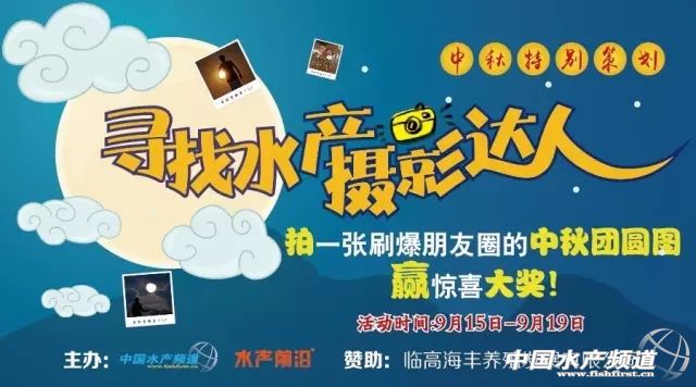 現(xiàn)在你是否已歸家,還是人在旅途,又或因為工作仍要堅守崗位呢?但無論你身在何處,都不會影響我們邀請你來參加“尋找水產(chǎn)攝影達(dá)人:拍一張刷爆朋友圈的中秋團圓圖,贏驚喜大獎!”2016中秋攝影大賽,過一個難忘而別樣的中秋佳節(jié)。 請快快拿起單反、數(shù)碼、手機給圓月留念,捕捉美好瞬間,用思念的歌吟唱夢回故鄉(xiāng),對歲月說你好吧! 只需動一動手指頭,你的充滿靈感的創(chuàng)意不但可以美美地刷爆朋友圈,更重要的還能獲得我們送出的驚喜大獎。 ...... 納尼?!有個叫“莫蘭蒂”大臺風(fēng)來攪局,大風(fēng)大雨賞不到月亮,拍不到美景?沒關(guān)系,月朦朧人朦朧,意境同樣美好;十五月亮十六圓,十六月色或者更醉人呢;拍不了月亮,分享一家人的其樂融融也很溫馨哦。