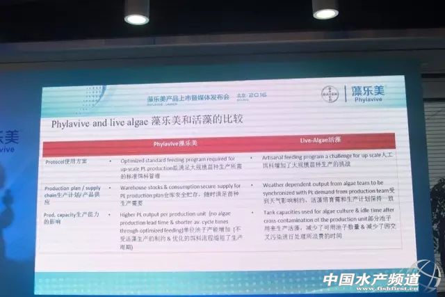 文/圖水產前沿雜志羅少蒙 藻樂美新產品發布儀式,由姚瑞清(左)、劉小燕(中)、DrWilliam(右)正式啟動 “藻樂美TM的上市是拜耳動保的重大進步,因為創新代表未來,藻樂美TM將在對蝦育苗行業產生重大影響。”拜耳(四川)動物保健有限公司水產業務總監劉小燕在新品發布會上說道。10月25日,拜耳(四川)動物保健有限公司在北京拜耳中心召開新品發布會,正式宣布在中國大陸上市藻樂美TM——一個源于歐洲的創新型的用于解決水產動物早期營養問題的產品。 藻樂美TM正式面市 據介紹,藻樂美TM是德國拜耳集團聯合TomAlgae公司(水產養殖專用藻粉研發及生產的國際先驅企業,總部位于比利時)研發的新型水產專用凍干藻粉,其藻種選自威氏海鏈藻并經過專業馴化,集活藻及人工餌料的優勢于一體,主要解決對蝦育苗過程中活藻品質不穩定、容易攜帶弧菌、原生動物或有害藻類等問題。“目前大多數企業做活藻培育都面臨成活率不高、成本高、技術門檻高的難題,大規模的微藻培育已經被苗場及標粗場視為主要瓶頸,微藻替代是一項很有發展潛力的產業。”TomAlgae公司總監DrWilliam介紹道,藻樂美從2013年開始研發,雖然從研發到上市只有短短的3年時間,但是由于其特定的生產工藝和穩定的高品質,目前已經在國外的跑道式育苗中取得了很好的驗證效果。 TomAlgae公司總監DrWilliam 拜耳藻樂美新品發布會現場 為什么要研發藻樂美TM? “據FAO數據顯示,由于人們對于健康優質蛋白的需求的增加,水產養殖總量將繼續增加,2016年水產養殖總量比2015年將上升5%。可以預見,水產品的進口還會上升,尤其在蝦的市場,供不應求會使更多的養殖者在此投入。然而,近年來極端的天氣和低成活率成為中國對蝦產業發展的瓶頸,拜耳以往研發的動物保健產品,都是側重于養殖后端,但是我們逐漸意識到,如果前端的問題沒有解決好,后端的養殖效果又該如何保證?早期營養對于水產動物的發育及健康情況有非常大的影響,在水產養殖行業,早期營養是關乎養殖成功與否的關鍵要素之一。而藻樂美TM是一個創新型的用于解決水產動物早期營養問題的產品,在養殖初期階段對于強化水產動物營養,提高水產動物活力方面有顯著的效果。”劉小燕說道。 拜耳(四川)動物保健有限公司水產業務總監劉小燕 拜耳(四川)動物保健有限公司20周年大事記 拜耳水產系列產品上市時間 據拜耳(四川)動物保健有限公司水產業務部技術經理姚瑞清介紹,活藻在育苗過程中的作用毋庸置疑,然而對于育苗企業而言,活藻的培育過程是育苗過程當中的一大困難,目前國內大多數企業活藻供給遠遠無法滿足其需求。“首先,對蝦育苗最佳的溫度范圍是26-31℃,然而大多數常用活藻的適宜溫度是18-23℃,高溫情況下,細菌等問題將頻繁發生;其次,培藻前期的設備投入及之后的運營維護費用相當高,且需要專業的活藻團隊進行藻類培育,專業的培藻師傅十分難覓;最后,在培育活藻過程中,真菌污染、雜菌生長、被敵害生物攝食等問題難以控制,常常導致藻類供給不上或是藻類營養不足等問題,從而影響了對蝦育苗的成活率。”姚瑞清分析道,根據蝦苗的需求,對蝦育苗過程中理想的微藻特征應當包括:合適的適用口徑(1至15微米);易消化;生長快速;適合大規模培育;培育穩定;營養充足;無病原體;在水中能夠均勻分布等條件,具備多項優勢的藻樂美TM產品應運而生。 拜耳(四川)動物保健有限公司水產業務部技術經理姚瑞清 藻樂美TM具有多種可能 相比于活藻,藻樂美TM在品質、營養、應用范圍、生產能力等方面都具有明顯的優勢(藻樂美與活藻的區別請看下圖)。據悉,藻樂美TM產自于溫帶海洋性氣候的比利時,得天獨厚的地域條件延長了藻類的培育時間,有助于藻類生產過程中的營養富集。作為在嚴格工廠化淡水條件下生產出的標準化產品,藻樂美具有良好的水中懸浮性,適合豐年蟲及溞狀幼體口徑攝食的規格,同時也絕不含有有害弧菌。 藻樂美TM和活藻的比較 另外,藻樂美TM在養殖初期階段對于強化水產動物營養、提高水產動物活力方面有著顯著的效果,富含優質的易于水產動物幼體消化及吸收利用的EPA、DHA等不飽和脂肪酸,從而可以提升水產動物的健康狀況。 “藻樂美TM不僅僅是一個營養產品,它更是一種管理工具。藻樂美TM在使用時需要進行水合的特點,使其成為一個強大的承載工具,益生菌、維生素、氨基酸、蝦青素、微量元素、中草藥等都可以通過水合過程進入藻樂美細胞。該操作方式既可以降低這些產品的使用量,又減少了它們對育苗水質的污染,同時又直接攝入蝦苗體內,提高了生物利用率。”姚瑞清說道。 媒體提問環節,從左到右分別是:阮勇軍、劉小燕、DrWilliam、姚瑞清 藻樂美TM將大規模用于對蝦育苗市場 據姚瑞清介紹,藻樂美TM在市場上的應用主要有兩個方面:第一,在育苗場的應用。藻樂美TM在蝦苗場的定位主要是作為育苗過程中營養穩定的蚤狀幼體餌料,當活藻不足或者品質不穩定時,及時補充活藻,并起到維持前期水質穩定,利于后期水質管理的重要作用;第二,在蝦苗標粗場的應用。藻樂美TM主要在豐年蟲無節幼體I期變態到無節幼體II期的過程中強化豐年蟲,提高豐年蟲的存活率和脂肪酸,利用強化后的豐年蟲去投喂,從而培育更大規格、更高活力的優質蝦苗。 使用藻樂美TM產品后,對蝦育苗的表現情況 在銷售渠道方面,拜耳(