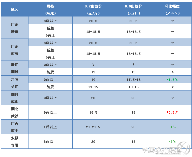 中國水產頻道獨家報道, 文/圖 杰大飼料 水產前沿實習編輯李靜 聯(lián)合發(fā)布 本周高溫天氣繼續(xù),有時又有雨水相伴,天氣反復無常,這時最考驗養(yǎng)殖戶的管理能力。近期加州鱸出現(xiàn)較多的問題是加不上料、甚至減料現(xiàn)象。能吃才能長,吃料量正常與否是關系到能不能及早出魚的關鍵因素,也是廣大養(yǎng)殖戶非常關心的。除天氣等不可控因素外,比較常見的有以下原因: 1、水質因素:主要指標(pH、氨氮、亞硝酸鹽)長期不在正常范圍內:比如安徽、江浙等區(qū)域pH容易偏高,高溫時藍藻泛濫,影響吃料,加州鱸對亞硝酸鹽十分敏感,容易導致攝食減少,吃料無力的現(xiàn)象;水體渾濁:加州鱸喜歡清水,水質渾濁時吃料會明顯受到影響(此時凈水效果比較明顯);溶氧不夠:養(yǎng)殖中后期存塘量增加或者新魚沒有及時分塘導致密度過高,引起吃料量達不到正常水平。 水溫偏高:夏天水淺的魚塘水溫相對較高,下午那餐投喂會受到一定影響,建議有條件的養(yǎng)殖戶可將魚塘挖深。 2、病蟲害:發(fā)生爛鰓、爛身、寄生蟲等病蟲害時首先的反應是吃料量減少,需要引起警惕。比較常見的寄生蟲錨頭蚤(俗稱丁蟲),雖然短時間內不會造成死魚,但典型的特征是吃料受影響,關鍵是早發(fā)現(xiàn)。 3、魚的體質:加州鱸肝臟情況是體質好壞的直接表征。肝臟情況受水質、病害、藥物、飼料的多方面影響。一般肝臟較差的魚吃料會明顯受到影響,逐步出現(xiàn)減料、閉口甚至死亡現(xiàn)象。在排除水質、病害、天氣等因素后,好的飼料也是增強魚體質、保持旺盛投喂的關鍵因素之一,可通過定期打樣解剖了解魚的生長、體型、肝臟狀況來了解飼料好壞。 對策:在出現(xiàn)長時間加不上料、甚至減料現(xiàn)象時,需要從水質、病害、體質等幾點上去綜合考慮,逐一排查:水質方面,定期調水,保證各項指標處于正常范圍內;藍藻水體少用速殺型藥物(硫酸銅等),容易導致水體渾濁。確定合理的放養(yǎng)密度,加強氧氣供給,有條件的挖深魚塘提高水深。針對常見病蟲害早發(fā)現(xiàn)早治療。通過選擇質量過關的飼料產品,增強魚自身的體質。定期打樣綜合了解魚目前的狀態(tài)。 各地行情解析 廣東順德:今天報價與上周持平,8兩上報價20.5元/斤,本周順德地區(qū)只剩零星幾塘舊魚存塘,已經(jīng)排期這段時間都會清塘了。因為順德新魚有小部分新魚已經(jīng)達到上市規(guī)格,新魚6兩上18-18.5元左右每斤,但因為高溫擔心風險依然比較大,所以大部分養(yǎng)殖戶都在等待合適時機出頭批魚。 廣東南海:今天8兩上報價價20.5元/斤,這周每天保持基本有2-3塘出魚,因為新魚陸續(xù)上市,對舊魚的市場沖擊會比較大,所以不少養(yǎng)殖戶都選擇適時賣魚清塘。 浙江湖州:統(tǒng)貨13元/斤左右。湖州地區(qū)的老口魚不耐運輸,所以同樣的規(guī)格,流通商還是不喜歡在湖州拉魚的,所以價格低于吳江地區(qū)。 江蘇吳江:吳江地區(qū)9兩上的報價是17.5-18元/斤。也有從8兩開始挑的,報價是17元/斤。這幾天氣溫稍微降低幾度,所以養(yǎng)殖戶都想著出魚,價格稍微有點降低。 湖北武漢:9兩上規(guī)格報價19元/斤,比上周價錢有所上升,但武漢達到上市規(guī)格的存塘加州量有限。 四川:本周價格同上周持平,9兩上價格今天報價依然20元/斤,因為存塘量不多,在本月應該是在高價位,四川地區(qū)的新魚在十月份才能上市,所以預計魚價還有上漲的空間。 廣西南寧:1斤以上價格20元/斤,比上周下跌1元/斤,目前南寧周邊存塘魚比較少,但也陸陸續(xù)續(xù)開始出魚。 安徽青陽:今天8兩以上報價18元/斤,比上周下跌2元/斤。因其他主產區(qū)不少養(yǎng)殖戶選擇清塘,新魚集中上市后對舊魚沖擊較大。青陽地區(qū)本周出魚量相比上周增加不少,目前存塘量還有40萬斤左右。 各區(qū)域本周與上周出塘價對比 |