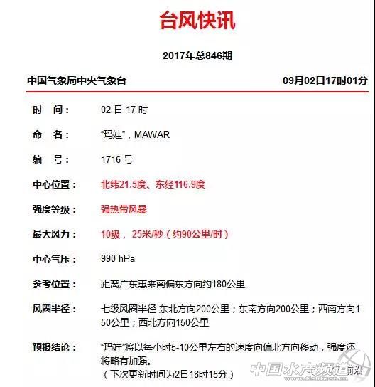 中國水產頻道獨家報道, “瑪娃”將于3日在汕尾到饒平沿海地區登陸 中央氣象臺9月2日11時發布“瑪娃”路徑圖 中央氣象臺9月2日17時發布臺風“瑪娃”快訊 中國天氣網消息:預計,“瑪娃”將以10公里左右的時速向偏西北方向移動,強度加強,并趨向廣東省東部沿海,可能于3日中午到傍晚以強熱帶風暴級在汕尾到閩南沿海登陸,較大可能在汕尾到饒平沿海地區登陸。受其影響,9月3日-4日廣東東部市縣將有一次暴雨到大暴雨過程,東部海面和沿海市縣風力將加大到9級~11級、陣風12級。廣東省氣象災害(臺風)Ⅲ級應急響應生效中,請繼續做好各項防御工作。 國家海洋預報臺9月2日下午繼續發布海浪黃色警報和風暴潮藍色警報 今年第16號臺風“瑪娃”(強熱帶風暴級)今天下午15時位于距離廣東惠來南偏東方向約190公里,并繼續向廣東汕尾到福建漳浦一帶沿海靠近,將于3日下午到晚上在這一帶沿海登陸。 受臺風“瑪娃”的影響,預計9月2日夜間到3日白天,南海東北部將出現4到7米的巨浪到狂浪區,臺灣海峽南部將出現3到4.5米的大浪到巨浪區;廣東東部沿岸海域將出現3到4米的大浪到巨浪,福建南部沿岸海域將出現2.5到3.5米的大浪。 廣東東部沿岸海域將出現2到3米的中浪到大浪,福建南部沿岸海域將出現1.5到2.5米的中浪到大浪,該沿岸海域海浪預警級別為藍色。 風暴潮方面,預計9月2日白天,福建省廈門到廣東省惠州沿海將出現30到80厘米的風暴增水,高潮位不會達到當地藍色警戒潮位。風暴潮預警級別為藍色。 珠海、深圳等地發布白色臺風+黃色雷暴+暴雨 “瑪娃”大敵當前,珠海緊急發布:暴雨黃色預警+黃色雷暴預警+臺風白色預警+高溫黃色預警。4大預警同時生效! 目前珠海已經閃電+雷暴+暴風,隨后的大雨也即將來襲大家注意防范! 9月1日下午深圳已經掛出了臺風白色預警! 周六白天起轉間歇性陣雨;受臺風環流影響,2日夜間至3日深圳市有暴雨到大暴雨;沿海和高地最大平均風可達7-8級,陣風9-11級。 預計,受臺風“瑪娃”影響,9月2日-4日汕頭市將有一次暴雨到大暴雨的降水過程,沿海陸地風力將達到8~10級,汕頭市氣象臺于2017年9月2日9時56分將臺風藍色預警信號升級臺風黃色預警信號,請注意防御。 此外,市民拍下的一幕:這個臺風來襲前,東莞發生的一幕讓人震驚! 市民拍下的一幕:這個臺風來襲前,東莞發生的一幕讓人震驚 昨天下午,東莞刮起一陣大風,東莞大道旁(第一國際對面),匯業大廈前面的一塊巨型廣告牌倒塌。 目前廣東多地臺風預警信號高懸 廣東省重大氣象災害應急辦公室已于9月1日7時啟動氣象災害(臺風)Ⅳ級應急響應若臺風此次真的在廣東登陸,廣東在12天內遭臺風“三連擊”將成為現實! 更重要的是關注風雨范圍和強度! 珠海未來7天天氣預報 臺風季水產養殖主要預防措施 1.固定增氧機,防止被風吹翻,導致跳閘停電; 2.提前檢查發電設施,保證正常運轉,備足油料,防止停電; 3.備足增氧劑,防止停電和發不出電; 4.提前降低池塘水位,防止暴雨造成水位過高,造成漫堤; 5.拆除棚膜,加固棚架; 6.備足解毒抗應激產品,可提前潑灑; 7.臺風暴雨來前必須停止投喂,降低影響。 8.注意水體溶氧變化防止魚缺氧浮頭。 9.夜晚定時巡邏魚塘檢測增氧設備是否正常工作等。 更多防范措施參考:驚魂未定!又來一個12級!14號臺風“帕卡”緊迫生成,27號或以狂風暴雨巔峰強度掃向海南,水產人挺住!(附防風雨停電攻略) 提醒!水產養殖朋友要密切關注強臺風動態,注意提前防范強風暴雨對池塘造成的災害影響,應及時檢修、加固堤壩,防止海水倒灌及做好避免水產物逃逸等工作。 外出作業時,提醒一定要注意人身安全! 祝福大家平安,魚蝦平安! 【關鍵字】: 水產養殖 臺風 “瑪娃”將于3日登陸 粵東 |