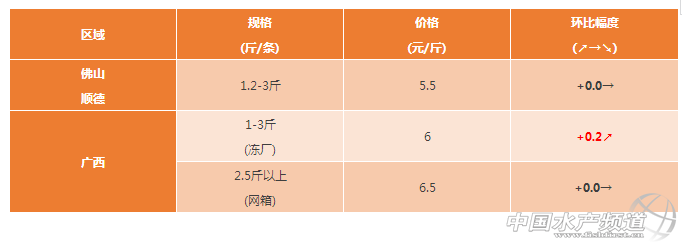 廣西區域:走市場叉尾價格與上周持平,走量不大;走凍廠的叉尾量相對比較大,價格上漲0.2元/斤,但進廠檢測較為嚴格,要求規格整齊、白肉、無藥殘。