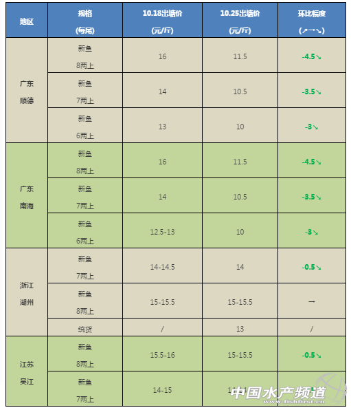 中國水產頻道獨家報道, 文/ 杰大飼料、水產前沿 李靜 聯合發布 近來天氣變化大,晝夜溫差比較大,適合寄生蟲繁殖,特別是錨頭鳋(俗稱丁蟲)寄生后容易引起花身、爛身等現象,影響賣相,建議做好預防并在出魚前打樣檢查。在魚塘進水后特別注意做好殺蟲消毒工作,養殖中后期投喂量大,水溫低有機質分解速度慢,水質容易惡化,要定期做好改底調水工作,防患于未然。 四大主產區行情分析 廣東順德:今天報價6兩上10元/斤,7兩上10.5元/斤,8兩上11.5元/斤,本周價格跌幅很大,基本上每天都不同價錢,因為6兩上價錢太低,大多數養殖戶都出7兩上規格,目前出魚高峰期,價錢也變動比較大。 廣東南海:今天6兩上報價10元/斤,7兩上報價10.5元/斤,8兩上報價11.5元/斤,8兩上價錢比昨天跌了近1.5元/斤,所以近來跌幅很明顯,因為跌幅太大,6兩上規格很多人不愿意出,因為報價過低,目前大多數養殖戶都選擇出魚7兩或8兩上。 浙江湖州:新口7兩抓起,報價14元/斤,8兩抓起15-15.5元/斤,具體看炮頭大小,統貨報價13元/斤。 江蘇吳江:新口7兩抓起,報價14-14.5元/斤,8兩抓起15-15.5元/斤。10月底吳江新口魚上市增多。 主產區各區域本周與上周出塘價對比 非主產區行情分析 四川成都:本周價格17.5元,同上周基本持平,現在開始市場上有少量新魚上市。目前市場供需趨于平衡,另因氣溫下降,本地市場開始有廣東加州鱸進入,到時可能對價格有一定沖擊。 湖北武漢:9兩上報價14-14.5元/斤,實際9兩上規格抓魚抓到接近1斤規格。 廣西南寧:1斤以上價格15.5-16.5元/斤,對比上周下降1.5元/斤,新魚上市量比較平穩,現在氣溫也比較適合生長,預計后市會保持一定的穩定。 |