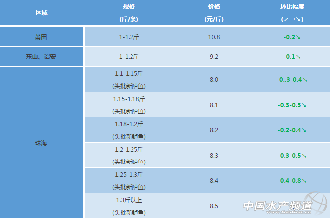 文/粵海飼料集團、水產前沿 彭曉君 中國水產頻道原創報道,福建莆田、東山、詔安區域:新鱸魚上市量增加,達上市規格魚約占40%,隨著上市鱸魚量的增加,市場價格稍微下跌,同比上周下跌0.2-0.3元/斤。 廣東珠海區域:市場抓魚規格要求1.1斤以上,追大魚抓,上層消費市場沒有刺激性消費,需求量有所下滑,流通大部分以深加工為主,目前鱸魚價格穩中持續有降,養殖戶夠大就買,往后價格也普遍看跌,魚中利用規格因素控制有序出魚。 病害:秋風起,水溫下降,魚類攝食較高溫期有所增加,魚塘亞硝酸鹽、氨氮相比高溫期也有所下降,也存在小部分客戶由于管理問題引起泛塘。入秋后,蟲害表現為斜管蟲、指環蟲較多,密集程度比往年增加,水體環境反復導致諾卡氏病菌斷斷續續爆發,表現為鱸魚肝臟、脾臟有白點,建議客戶少換水 【關鍵字】:海鱸 海鱸價格 水產養殖 |