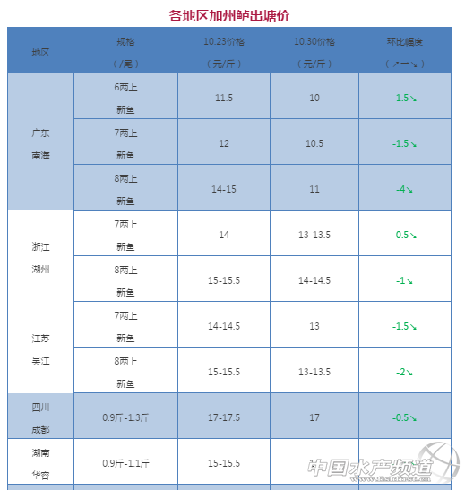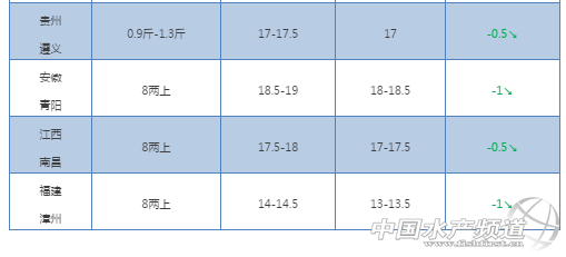 2、浙江湖州、江蘇吳江、四川、湖南等地新魚開始大量上市,貨源充足,目前當地魚價行情不好,同時也受到廣東地區新鱸降價的影響,上周價格都出現了不同程度的下跌,其中跌幅最大的是江蘇吳江8兩以上的魚,下跌了2元/斤。