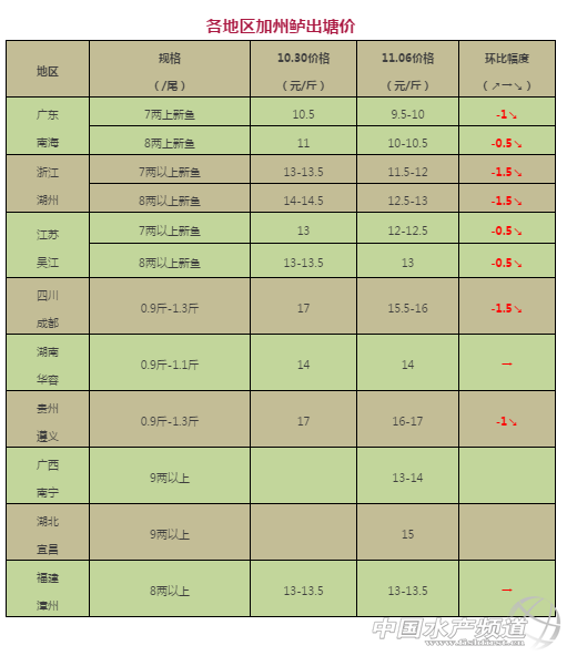 中國水產頻道獨家報道, 文/圖 何氏水產、水產前沿 李靜 加州鱸 1、廣東地區新鱸價格比上周持續回落0.5-1元/斤,現在養殖戶出塘以8兩以上規格為主,價格還是根據魚頭大小來決定的,由于現在出塘價格不是很理想,部分養殖戶惜售,出魚產地集中在南海九江、順德杏壇、南朗等地。現在廣東新魚與本地魚都大量上市,導致市場價格沒有競爭力,流通商出現微利時代,有些城市甚至虧本。現在出塘價格已經比較低,預測本周價格不會有太大的變化。 2、浙江湖州、江蘇吳江、四川、貴州等地新魚開始大量上市,貨源充足,目前當地魚價行情不好,同時也受到廣東地區新鱸降價的影響,上周價格都出現了不同程度的下跌,跌幅在0.5-1.5元/斤不等。 |