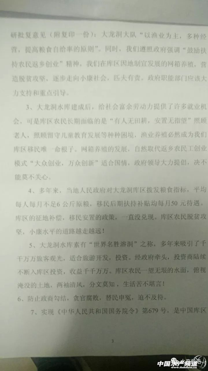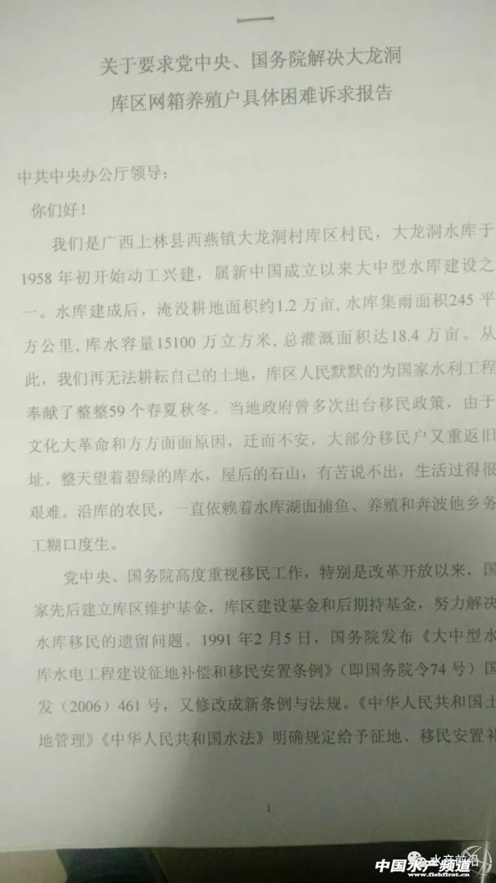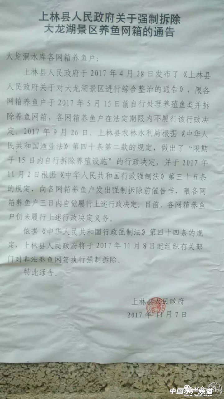 中國水產頻道獨家報道, 文/水產前沿 綜合報道 昨夜,廣西南寧市上林縣農商會會長潘健章(以下簡稱“潘會長”)致電筆者尋求協助,表示上林縣有八百多萬斤不同規格的網箱養殖淡水魚急需處理,原因是政府將于2017年11月8日起,預計一個月內將對該縣非法養魚網箱強制拆除。 據潘會長介紹,大龍湖屬于風景區,同時屬于飲用水源,屬政府規定的禁養區。近年來不斷有養戶在該區域進行非法養殖,對大龍湖風景區水質及飲用水源造成一定程度的污染。 潘會長還向筆者反映,關于網箱拆除的通告,上林縣人民政府等有關部門已向當地養殖戶發出過多次。2017年4月28日發布了《上林縣人民政府關于對大龍湖景區進行綜合整治的通告》,限各網箱養魚戶于2017年5月15日前自行處理養殖魚類并拆除養魚網箱;上林縣農林水利局2017年9月26日根據《中華人民共和國漁業法》第四十條第二款的規定,做出了“限期于15日內自行拆除養殖設施”的行政決定,并于2017年11月2日根據《中華人民共和國行政強制法》第三十五條的規定,向各網箱養魚戶發出強制拆除前催告書,限各網箱養魚戶三日內自覺履行上述行政決定;2017年11月7日,上林縣人民政府依據《中華人民共和國行政強制法》第四十四條的規定發布《上林縣人民政府關于強制拆除大龍湖景區養魚網箱的通告》,通告表示將于2017年11月8日起組織有關部門對非法養魚網箱執行強制拆除。 上林縣人民政府關于強制拆除大龍湖景區養魚網箱的通告 1979年,該水庫允許漁業生產的文件 2017年8月21日,該地區5名養戶自費去北京上訪的文件 2017年9月26日,上林縣農林水利局對該地某養殖戶做出的處罰決定文件 “今天是該地區網箱強制拆除的第一天,參與拆除的政府相關工作人員超過百人,并攜帶警犬、配有救護車等。”據上林縣某養殖戶反映,當初因修建水庫,自家的農田被淹,多年來只能靠漁業為生。如今網箱拆除,生計難以維持。他們在今年8月21日曾組團到北京上訪,卻被告知不能越級上訪,訴求被返回本地相關部門處理。 潘會長告訴筆者,政府近日要求上林縣商會積極提供渠道,協助養殖戶賣魚。養殖戶除了自己聯系魚中,也可以通過上林縣商會的渠道,盡量按照市場價格從優賣魚。 以下為上林縣急需清理的網箱養殖品種及數量清單,希望廣大有需要的朋友盡快聯系潘健明報價和收購,電話:13924846322 【關鍵字】:清拆 網箱 水產養殖 |