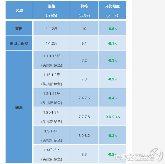 文/粵海飼料集團、水產前沿 彭曉君 中國水產頻道原創報道,福建莆田、東山、詔安區域:鱸魚上市量增加,達上市規格魚超過60%,隨著上市鱸魚量的增加,市場價格稍微下跌,同比上周下跌0.2-0.3元/斤。 廣東珠海區域:魚價下降原因分析:(1)現頭批魚規格集中1.1——1.3斤,消費市場淡季,導致供過于求,導致價格波動下降;(2)經銷商開始籌備資金與飼料廠結賬,養殖戶塘租集中到期繳費,所需資金量急極上升,部分客戶開始拋售性買魚;(3)魚中市場有新力量進入,沒有做飼料的魚中及養殖戶群體不能支撐其流通需求的就會利用價格桿桿平衡,導致價格波動性很大;(4)傳統東北市場需求大規格鱸魚,現中鱸缺乏,難以支撐東北線流通,市場進一步壓縮。整體分析不變,魚價持續望跌。 病害:秋風起,水溫下降,魚類攝食較高溫期有所增加,魚塘亞硝酸鹽、氨氮相比高溫期也有所下降,也存在小部分客戶由于管理問題引起泛塘。入秋后,蟲害表現為斜管蟲、指環蟲較多,密集程度比往年增加,水體環境反復導致諾卡氏病菌斷斷續續爆發,表現為鱸魚肝臟、脾臟有白點,建議客戶少換水。 |
