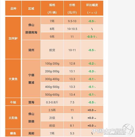 文/粵海飼料集團、水產前沿 彭曉君 中國水產頻道原創報道,加州鱸:湖州區域目前出魚以統貨為主,條子(分級魚)沒有價格,魚販子不肯收條子,主要因為受到廣東成品魚的沖擊。佛山順德加州鱸爛鰓,爛身,出血,諾卡氏較為嚴重,錨頭蚤,部分有花身。 大黃魚:養殖魚規格主要為小魚(50g以下)及400g以上大魚。大規格大黃魚存魚量較多,價格持續低迷。本周魚價同比上周下跌0.1-0.2元/斤。 太陽魚:目前太陽魚投喂3#料,魚頭4兩左右,現在晝夜溫差大,吃料減慢,病害主要爛嘴,白肝為主。 牛蛙:澄海牛蛙主要規格在3-6兩,中蛙價格相對較低。目前養戶主要考慮繼續養殖,市場中蛙銷售量少,市場價格同比上周下跌0.5-0.6元/斤。 鯽魚:價格有下降趨勢,主要是近期養殖戶賣魚較多,沖擊市場。 |