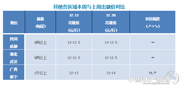 中國水產(chǎn)頻道獨家報道, 文/圖 杰大飼料、水產(chǎn)前沿李靜 聯(lián)合發(fā)布 各產(chǎn)區(qū)今日塘頭價及市場分析 廣東順德:今天報價6兩上10.5-10.6元/斤,7兩上10.7-10.8元/斤左右,8兩上11元/斤,比上周升幅超1元/斤!本周受冷空氣影響,外地過來的魚車收魚量增加。目前行情不錯,出魚開始有所增多,但以7兩、8兩上規(guī)格為主,北運車明顯較多。 廣東南海:6兩上10.5元/斤,7兩上10.7元/斤,8兩上11元/斤,本周升幅明顯。受魚價回升影響,本周出魚的養(yǎng)殖戶比上周有所增加,但大多都選擇出8兩上規(guī)格,6兩上規(guī)格目前已經(jīng)很少人出。在當?shù)厝媵~格的養(yǎng)殖戶也有所增加,3-7兩價價格在10.2元/斤左右,具體還是看原塘的魚頭和平均規(guī)格大小。 浙江湖州:今天8兩上規(guī)格12元/斤,統(tǒng)貨報價10-11元/斤。湖州地區(qū)目前選擇賣統(tǒng)貨的養(yǎng)殖戶比較多,近期魚價基本上比較穩(wěn)定。 江蘇吳江:吳江新口8兩報價為12元/斤,9兩報價12.5元/斤。目前吳江地區(qū)選擇賣統(tǒng)貨的比較少,按照目前的標魚價格,加上水溫較低,大部分養(yǎng)殖戶目前處于觀望狀態(tài),計劃到明年3月和4月份才開始出魚。 四川成都:今天報價格13元/斤,昨天下午9兩上規(guī)格有報價出13.5元/斤,今早養(yǎng)殖戶9兩上出13元/斤。近期有可能會升高,主要受廣東漲價影響。 湖北武漢:本周9兩上報價12-12.5元/斤,但這兩天報價以12.5元/斤為主,后市看好。 廣西南寧:1斤以上報價13-14元/斤,與上周相比上漲,預計后市價還有一定上漲空間。 本周水花200-230元/萬,與上周相比價格有所下降。目前絕大多數(shù)養(yǎng)殖戶還是覺得價格偏高,加上水溫低,所以放苗的人不多。 【關鍵字】:鱸魚 塘頭價 水產(chǎn)養(yǎng)殖 |