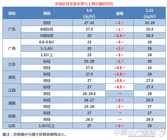 中國水產頻道獨家報道, 受全國大幅降溫影響,不少養殖戶不愿意出魚,導致鱖魚價格再次飆升。廣東、廣西、江蘇、湖北和山東等多省區價格都突破了29元/斤,甚至更高。后市行情繼續被看好! 文/ 水產前沿 李靜 近日,全國大范圍降溫,但與本月上旬湖北、河南、安徽、江蘇等多省大雪封路相比,本周路況明顯轉好,大部分水產流通商已恢復正常供貨。而回顧上周大雪封路車輛滯留帶來的影響,筆者調查發現,還是不少水產流通商在本次大雪封路事件中損失慘重。 據《水產前沿》不完全統計,以廣東勇記水產為例,其中一臺1月3號發西安的車經過近6個日夜,終于在1月9日到達西安,而到達目的地后經統計發現,一車魚全部死亡,甚至有1/4已經發臭。這車魚主要是價值較高的鱖魚和加州鱸,共計1萬5千斤,價值約45萬。 何氏水產也有兩臺1月3號發西安的車在1月9日左右到達,損耗近半。 除了以上兩個案例,還有1月3號左右從北方發往廣東的一車作鱖魚餌料魚的小鯽魚,經過幾天封路到達廣東后奄奄一息,該水產商販抱著一絲希望放進魚塘暫養,可剛放塘沒多久便全軍覆沒,2萬斤的小鯽魚只能全部埋掉。 經歷了上周大雪堵車封路的糟糕路況后,近日水產流通商逐漸恢復正常供貨和收魚,但因受到全國大幅降溫影響,不少養殖戶不愿意出魚,進而導致這兩日鱖魚價格再次飆升,廣東、廣西、江蘇、湖北和山東都突破了29元/斤,甚至廣東8成標桂有人訂29.3元/斤的高價,漲幅驚人,且多地后市看好。 餌料魚:清遠麥鯪4元/斤、土鯪4.7元/斤、巴西雕3.4元/斤、鳊魚仔3.5元/斤;佛山土鯪4.7元/斤、麥鯪4.2元/斤、巴西雕3.2元/斤;江門鶴山麥鯪4.1元/斤、泰鯪4.3元/斤、土鯪4.8元/斤;肇慶麥鯪4.3-4.5元/斤、鳊魚4元/斤、土鯪4.6-4.8元/斤;湖北小雜鯽1.5-2.2元/斤。 以上價格及行情分析僅供參考,市場有風險,入市需謹慎。 【關鍵字】: 桂花魚 塘頭價 水產養殖 |