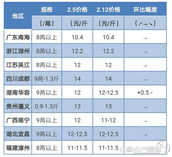 中國水產頻道原創報道,1.今年鱸魚貨源充足,價格保持了3周沒有波動。 2.這周8兩以上規格開塘價格依然是10.4元/斤,但是超大鱸魚已經開始頻繁出現,1成超大鱸魚便宜0.2元/斤,以此類推,反而偏小規格的沒有下跌跡象。現在超大鱸魚的收購價為9元/斤,如果超出3成價格還會更低。年前的量已經準備充足,預估下周行情應該與上周持平。 3.湖南華容加州鱸價格出現0.5元/斤的上漲幅度,其他地區的價格與上周持平。 |