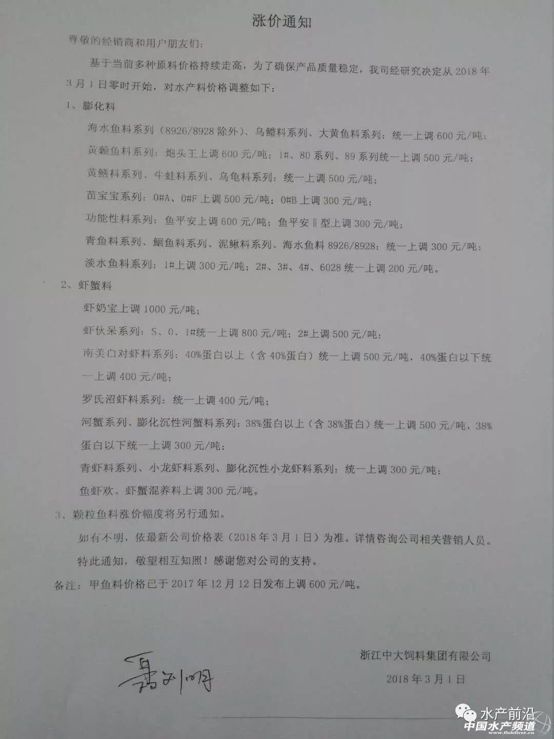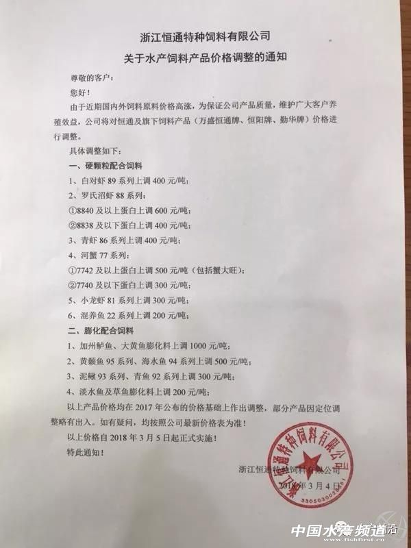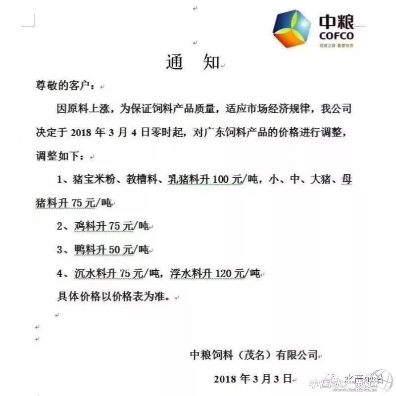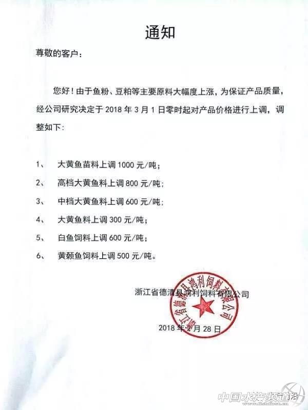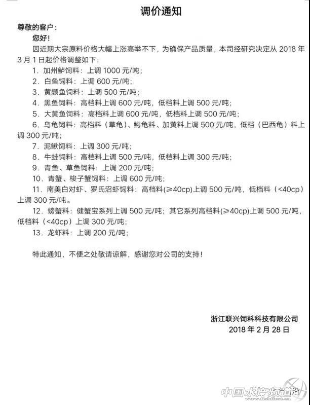 華南市場“淪陷” 昨天,茂名市飼料行業協會公布了飼料價格上調消息,其中浮水魚料上調120元/噸,沉水魚料上調75元/噸。 具體如下: 因原料大幅度上升,為保證飼料產品質量適應市場經濟規律,保障行業健康發展,建議飼料產品價格作如下調整: 一、豬飼料(乳豬料,教槽料上調100元/噸。小、中、大、母豬料、上調75元/噸)。 二、雞飼料(雞料上調75元/噸) 三、鴨飼料(鴨料上調50元/噸) 四、水產飼料(魚料:浮水料120元/噸,沉水料75元/噸) 于2018年3月4號凌晨開始上調。 茂名市飼料行業協會 2018年3月3號 今天,茂名果然多家料企緊跟漲價的節奏,據悉有茂名通威、茂名六和、茂名中糧,而明天或者后天......或會有更多的飼料企業漲價。 具體如下: 茂名通威九鼎飼料有限公司漲價通知 因原料大幅度上升,為保證飼料產品質量適應市場經濟規律,保障行業健康發展,飼料產品價格作如下調整: 豬飼料(乳豬料,教槽料上調100元/噸。小、中、大、母豬料、上調75元/噸)。 雞飼料(雞料上調75元/噸) 鴨飼料(鴨料上調50元/噸) 水產飼料(魚料:浮水料120元/噸,沉水料75元/噸) 于2018年3月4號凌晨開始上調。 茂名通威九鼎飼料有限公司 2018年3月3號 茂名六和飼料有限公司漲價通知 因原料大幅度上升,為保證飼料產品質量適應市場經濟規律,保障行業健康發展,對飼料產品價格作如下調整 一、豬飼料(乳豬料,教槽料上調100元/噸。雙喜小豬、生物仔豬上調100元/噸、其他小、中、大、母豬料、上調75元/噸)。 二、鴨飼料(鴨料上調50元/噸) 三、水產飼料(魚料:浮水料120元/噸) 于2018年3月4號凌晨開始上調。 茂名六和飼料有限公司 2018年3月3號 華東再有大動作 今天,華東市場仍然有大動作! 接力昨天,甚至前幾天的火力漲勢,今天又有一大波飼料企業漲價,有浙江恒通、天邦寧波、浙江中大(3月1日公布漲價)、浙江鴻利(2月28日公布漲價)、浙江聯興(2月28日公布漲價)等料企。涉及品種囊括魚、蝦、蟹、、蛙、苗料,其中仍以加州鱸魚料、大黃魚料、大黃魚苗料漲價最高,達1000元/噸。 具體如下: 飼料猛漲?魚蝦價更要漲! 面對飼料價格突飛猛漲,最難受糾結的就是養殖戶,這意味著他們要為養殖付出更高的成本。 但值得欣慰的是,目前全國南北的魚蝦價格也都在持續大幅上漲。 【關鍵字】:飼料 飼料漲價 水產養殖 |