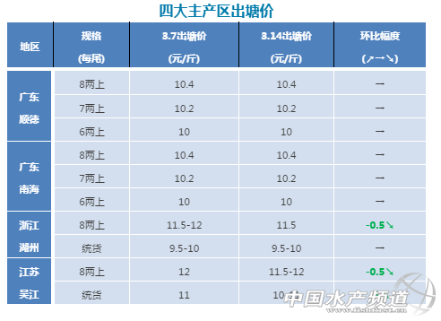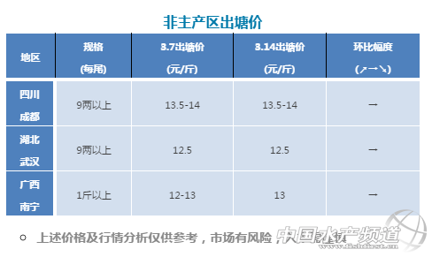 中國水產頻道獨家報道, 魚價暫時低迷,但后市走勢會如何? 文/圖 杰大飼料 水產前沿實習編輯 李曉欣 聯合發布 本周華南地區加州鱸塘頭價企穩,華東地區價格略有下降,其中江蘇吳江地區跌幅明顯,8兩上價格下跌0.5元/斤,統貨下跌1元/斤。據悉,隨著氣溫回升,吳江地區部分加州鱸養殖戶為了清塘放苗而出魚較多,魚量供過于求,致使價格小幅下跌。 產區加州鱸行情 廣東順德:今天報價6兩上10元/斤,7兩上10.2元/斤,8兩上10.4元/斤。本周價格變動不大,近來順德地區清塘養殖戶較多,舊魚存塘有所減少。杏壇、樂從、勒流部分區域還有一定的存塘量,當地養殖戶因目前魚價低選擇暫時不出魚。 廣東南海:今天報價6兩上10元/斤,7兩上10.2元/斤,8兩上10.4元/斤。近來,南海地區收魚量減少,流通商挑魚時較嚴格,對超大魚存在壓價現象。九江附近清塘較多,沙頭區域還有較多存塘舊魚。臨近投苗旺季,省內外許多養殖戶選擇到南海購買水花,水花需求量明顯增加。 浙江湖州:今天報價8兩上11.5元/斤,統貨報價9.5-10元/斤,8兩上價格相比上周下降0.5元/斤。湖州地區許多養殖戶為清塘放苗而出魚積極,出魚量大,但目前魚車捉魚量較少,故魚價比較低迷。 江蘇吳江:新口8兩上報價11.5-12元/斤,統貨報價10-11元/斤,本周價格相比上周下跌0.5-1元/斤。據悉,價格下跌一方面是受到浙江湖州魚價影響,另一方面,隨著氣溫回升,吳江部分養殖戶為了清塘放苗而出魚較多,魚量供過于求,致使價格小幅下跌。 四川成都:今天報價9兩上13.5-14元/斤,對比上周價格持平。四川地區近期養殖戶出魚積極,放水花的養殖戶也增多,預計近期四川地區價格變動不大。 湖北武漢:今天報價9兩上12.5元/斤,對比上周價格持平。近期養殖戶開始出魚,但存塘量仍較大。 廣西南寧:今天報價1斤以上13元/斤,價格變動不大。目前南寧地區養殖戶存塘量減少,預計后市價格或將有所上升。 【關鍵字】:加州鱸 價格行情 水產養殖 |
