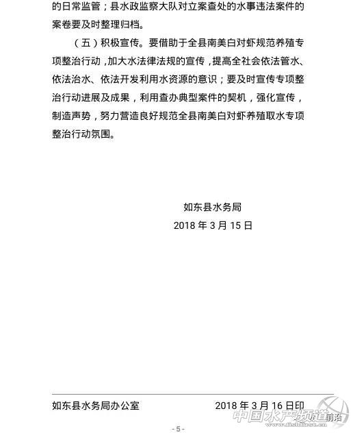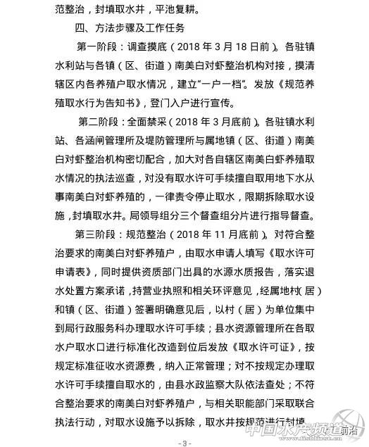 拆除小棚或達(dá)到了2000張 中國(guó)水產(chǎn)頻道原創(chuàng)獨(dú)家報(bào)道,今天是周六,南通如東及周邊對(duì)蝦養(yǎng)殖的拆棚工作仍然持續(xù)。 據(jù)當(dāng)?shù)仞B(yǎng)殖戶向中國(guó)水產(chǎn)頻道稱,今天拆棚地點(diǎn)主要有如東大豫鎮(zhèn)九龍村、長(zhǎng)沙鎮(zhèn)富鹽村大約17戶人家,今天豐利鎮(zhèn)雖然沒有拆棚,但有4臺(tái)挖掘機(jī)開到塘頭。據(jù)了解,今天所拆的主要是去年8月份新建的小棚,很多未建好或未有投苗。 另據(jù)某知情人士A不完全統(tǒng)計(jì),南通市管轄的海安與如東西邊交界大約有小棚7000多張,目前已經(jīng)拆除約1000張,主要也是新建的小棚。另外,如東長(zhǎng)沙鎮(zhèn)富鹽村拆約100多張、豐利鎮(zhèn)環(huán)農(nóng)村約100多張、大豫鎮(zhèn)九龍村約200多張、苴鎮(zhèn)劉埠村50張,還有如皋地區(qū)約150張。總數(shù)或?qū)⒔?000張。 據(jù)悉,近一兩天來有部分養(yǎng)殖戶被約談、溝通和做思想工作,今天拆棚的進(jìn)度有所加快。 還有一些養(yǎng)殖戶表示,今天還對(duì)抽取地下水養(yǎng)殖的水井進(jìn)行封填,后來中國(guó)水產(chǎn)頻道了解,目前沒有水井被封填,只是謠傳信息。然后,消息也并非全是空穴來風(fēng),因?yàn)轲B(yǎng)殖戶的確收到了一份最新的文件——《如東縣水務(wù)局關(guān)于開展規(guī)范全縣南美白對(duì)蝦養(yǎng)殖取水行為專項(xiàng)整治行動(dòng)的通知》。 2018年3月底前全面禁采地下水養(yǎng)殖 3月16日,如東縣水務(wù)局發(fā)布了一份最新的文件《縣水務(wù)局關(guān)于開展規(guī)范全縣南美白對(duì)蝦養(yǎng)殖取水行為專項(xiàng)整治行動(dòng)的通知》,涉及的具體內(nèi)容為在全縣范圍內(nèi)開展規(guī)范南美白對(duì)蝦養(yǎng)殖取水行為專項(xiàng)整治行動(dòng)。 取水行為專項(xiàng)整治行動(dòng)內(nèi)容 本次專項(xiàng)整治行動(dòng),在各鎮(zhèn)(區(qū)、街道)集中組織排查、全面清理確認(rèn)的基礎(chǔ)上對(duì)全縣南美白對(duì)蝦養(yǎng)殖取水行為全面進(jìn)行規(guī)范: (一)嚴(yán)禁非法取用地下水養(yǎng)殖南美白對(duì)蝦。凡是未取得取水許可手續(xù)的南美白對(duì)蝦養(yǎng)殖戶,一律停止取用地下水從事南美白對(duì)蝦養(yǎng)殖,按照生態(tài)養(yǎng)殖的要求開展規(guī)范整治。 (二)符合整治要求的南美白對(duì)蝦養(yǎng)殖。責(zé)令限期補(bǔ)辦取水許可手續(xù),發(fā)放《取水許可證》,按規(guī)定征收水資源費(fèi)。對(duì)不按規(guī)定辦理取水許可手續(xù),繳納水資源費(fèi)的養(yǎng)殖戶,按水法律法規(guī)嚴(yán)肅查處。 (三)不符合整治要求的南美白對(duì)蝦養(yǎng)殖。與相關(guān)職能部門采取聯(lián)合執(zhí)法行動(dòng),全力支持各鎮(zhèn)(區(qū)、街道)開展規(guī)范整治,封填取水井,平池復(fù)耕。 取水行為專項(xiàng)整治方法步驟及工作任務(wù) 第一階段:調(diào)查摸底(2018年3月18日前)。各駐鎮(zhèn)水利站與各鎮(zhèn)(區(qū)、街道)南美白對(duì)蝦整治機(jī)構(gòu)對(duì)接,摸清轄區(qū)內(nèi)各養(yǎng)殖戶取水情況,建立“一戶一檔”。發(fā)放《規(guī)范養(yǎng)殖取水行為告知書》,登門入戶進(jìn)行宣傳。 第二階段:全面禁采(2018年3月底前)。各駐鎮(zhèn)水利站、各涵閘管理所及堤防管理所與屬地鎮(zhèn)(區(qū)、街道)南美白對(duì)蝦整治機(jī)構(gòu)密切配合,加大對(duì)各自轄區(qū)南美白蝦養(yǎng)殖取水情況的執(zhí)法巡查,對(duì)沒有取水許可手續(xù)擅自取用地下水從事南美白對(duì)蝦養(yǎng)殖的,一律責(zé)令停止取水,限期拆除取水設(shè)施,封填取水井。局領(lǐng)導(dǎo)組分三個(gè)督查組分片進(jìn)行指導(dǎo)督查。 第三階段:規(guī)范整治(2018年11月底前)。對(duì)符合整治要求的南美白對(duì)蝦養(yǎng)殖戶,由取水申請(qǐng)人填寫《取水許可申請(qǐng)表》,同時(shí)提供資質(zhì)部門出具的水源水質(zhì)報(bào)告,落實(shí)退水處置方案承諾,持營(yíng)業(yè)執(zhí)照和相關(guān)環(huán)評(píng)意見,經(jīng)屬地村(居)和鎮(zhèn)(區(qū)、街道)簽署明確意見后,以村(居)為單位集中到局行政服務(wù)科辦理取水許可手續(xù);縣水資源管理所在各取水戶取水口進(jìn)行標(biāo)準(zhǔn)化改造到位后發(fā)放《取水許可證》,按規(guī)定標(biāo)準(zhǔn)征收水資源費(fèi),納入正常管理;對(duì)不按規(guī)定辦理取水許可手續(xù)擅自取水的,由縣水政監(jiān)察大隊(duì)依法查處;不符合整治要求的南美白對(duì)蝦養(yǎng)殖戶,與相關(guān)職能部門采取聯(lián)合執(zhí)法行動(dòng),對(duì)取水設(shè)施予以拆除,取水井按規(guī)范進(jìn)行封填。 第四階段:檢查驗(yàn)收(2018年12月底前)。規(guī)范全縣南美白對(duì)蝦養(yǎng)殖取水行為的驗(yàn)收工作在各鎮(zhèn)(區(qū)、街道)組織初驗(yàn)后,由縣水務(wù)局會(huì)同縣南美白對(duì)蝦養(yǎng)殖整治辦公室一并進(jìn)行。 據(jù)養(yǎng)殖戶表示,今天拆棚不封井,但并不代表未來不封填取水井,可能還會(huì)面臨斷電。 且不說哪些小棚合法與不合法,以目前南通市小棚20多萬張,其中如東地區(qū)約12萬張,(昨天報(bào)道稱南通如皋總數(shù)為3萬張的數(shù)字是錯(cuò)誤,應(yīng)為20多萬張。在此再次糾正)幾乎都是以抽取