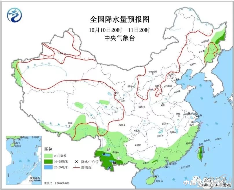 10月10日20時至11日20時,吉林東南部山區(qū)、青海南部、新疆西部、西藏中東部等地的部分地區(qū)有小雪或雨夾雪;東北地區(qū)東部、江南東南部、華南東部和南部、云南、西藏中東部、四川南部等地的部分地區(qū)有小到中雨,其中,云南西南部、臺灣島東部局地有大雨(見圖3)。