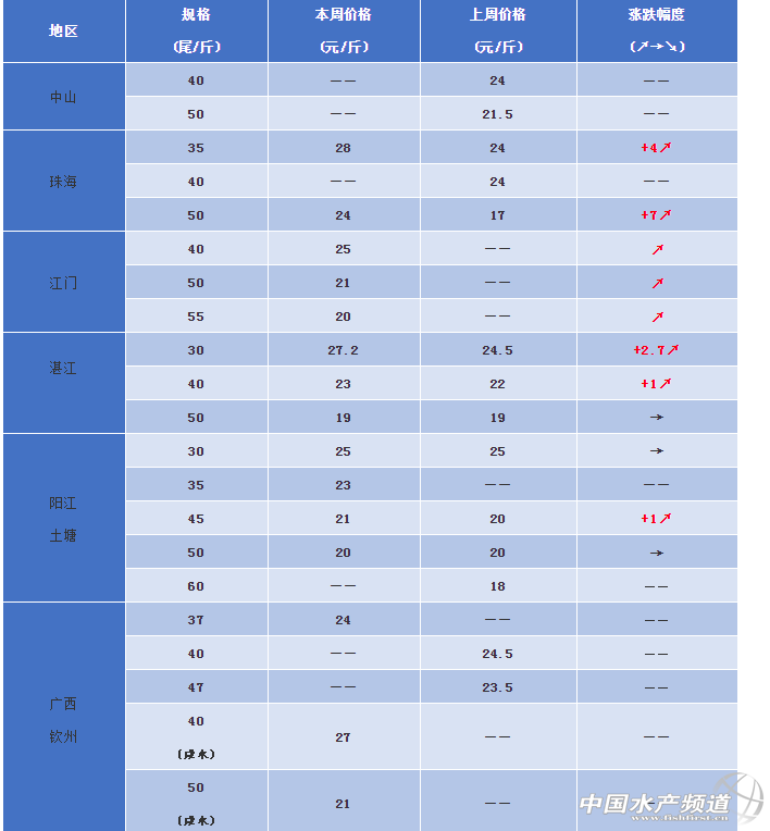 陽江(土塘):本周蝦價30頭25元/斤,35頭23元/斤,40頭21元/斤,50頭20元/斤,60頭18元/斤。陽江地區本周蝦價較穩定,體色、活力好的蝦價格也好,業內人士預計價格要到冬至前才能有所上漲。