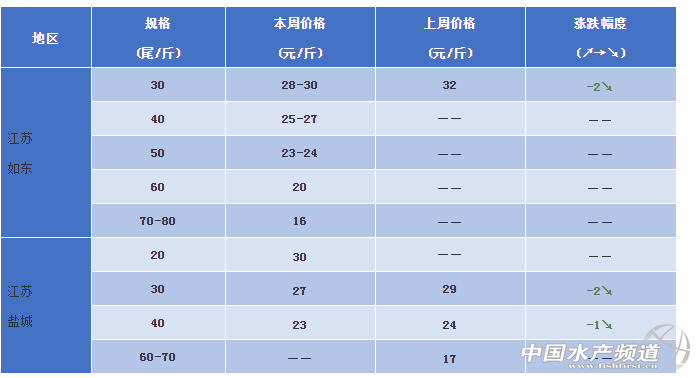 江蘇如東:今日蝦價30頭內28-30元/斤;40頭內25-27元/斤,50頭內23-24元/斤,60頭內20元/斤,70-80頭內16元/斤。本周蝦價維穩,降溫影響投喂量,但是對蝦發病情況不多,情況良好。