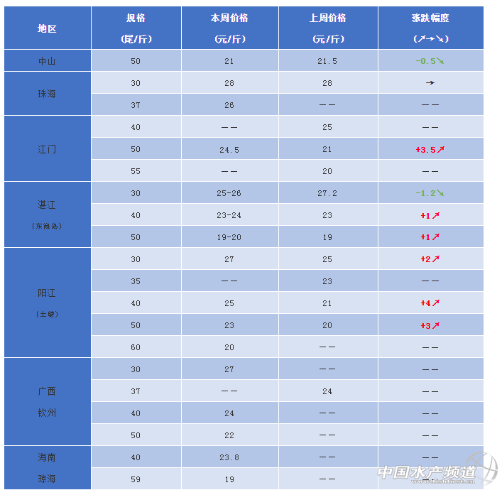 陽江(土塘):本周蝦價30頭27元/斤,40頭25元/斤,50頭23元/斤,60頭20元/斤。陽江地區本周蝦價漲幅較大,存塘量少是主要原因。