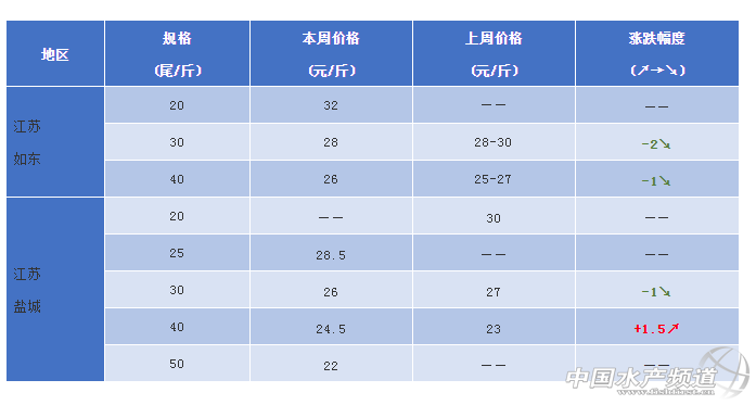 江蘇如東:今日蝦價20頭32元/斤,30頭28元/斤;40頭26元/斤,本周蝦價微跌,降溫影響投喂量,但是對蝦發病情況不多,情況良好。