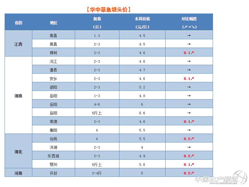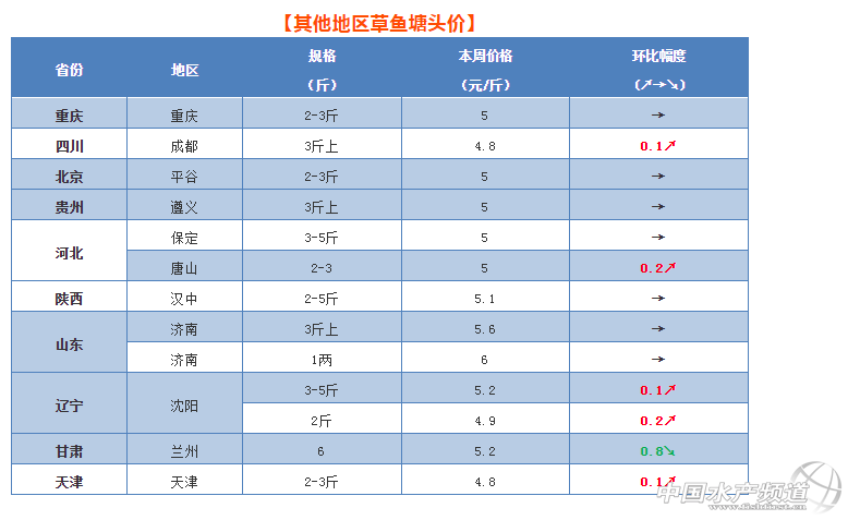本周華東地區草魚行情也不斷聽到利好消息。其中,江蘇高郵、淮安、無錫等地均出現回暖;浙江地區有小幅上漲;福建地區目前整體價格仍然保持穩定,部分地區草魚開始好賣了一些。