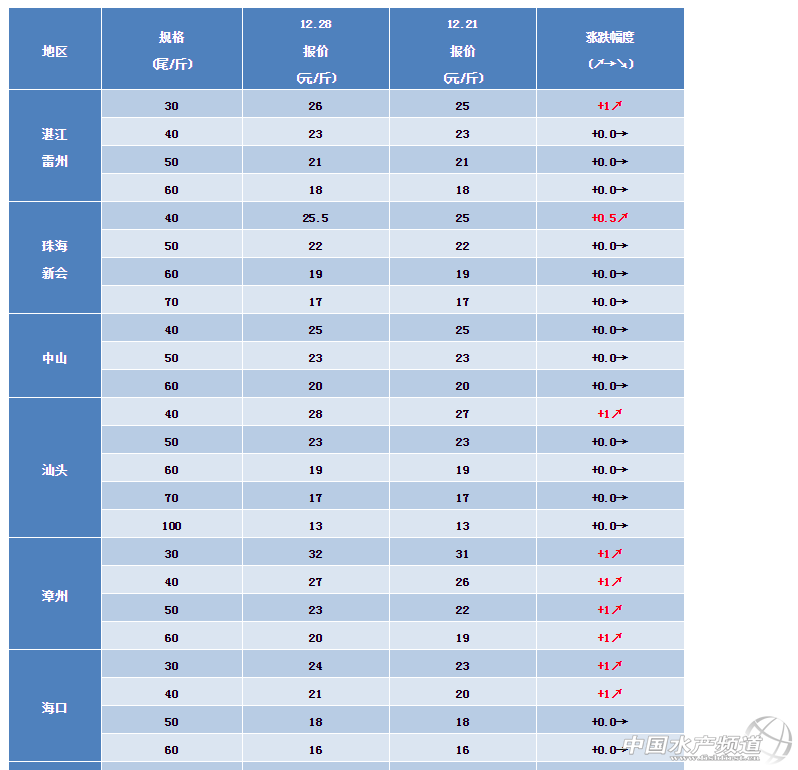 汕頭區域:本周蝦價40頭28元/斤,50頭23元/斤,60頭19元/斤,70頭17元/斤,100頭13元/斤。12月病害增多,高位池大規格蝦存塘量減少,養殖主要規格在30-100條。土塘大多池塘剩余蝦少,隨著溫度下降,抓蝦量減少。本周蝦價格相對穩定。