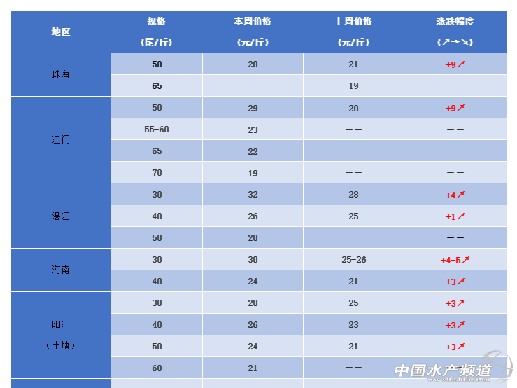 陽江:本周蝦價30頭28元/斤,40頭26元/斤,50頭24元/斤,60頭21元/斤。本周陽江地區價格均漲3元/斤,上市蝦較少,價格正常上漲。
