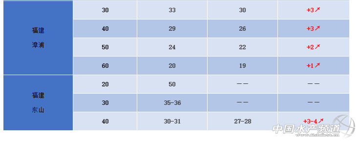 福建:今日蝦價30頭33元/斤,40頭29元/斤,50頭24元/斤,60頭20元/斤。本周漳浦地區價格小幅度上漲,降溫導致水質惡化,高位池多發腸炎、偷死情況;東山地區20頭50元/斤,30頭35-36元/斤,40頭30-31元/斤。