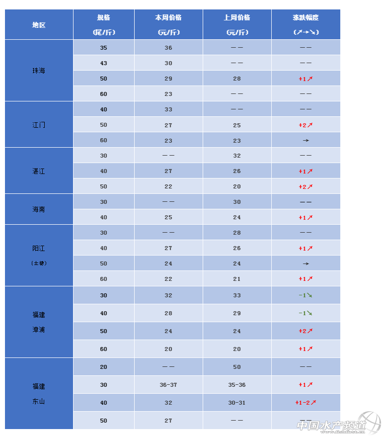 珠海:本周蝦價35頭36元/斤,43頭30元/斤,50頭29元/斤,55頭24元/斤,60頭23元/斤。白水蝦已經出完,市場只有小部分冬棚蝦,大規格蝦價格較好。