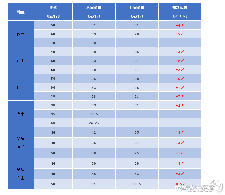 福建:漳浦地區:今日蝦價30頭42元/斤,40頭35元/斤,50頭30元/斤。本周漳浦地區價格漲幅較大,有從業者表示,現在對蝦一天一個價,需求也增加了,所以價格漲的厲害。東山地區:30頭39元/斤,40頭36元/斤,50頭的31元/斤。有養殖戶表示今年蝦價不如去年,蝦發病情況較多,很多養不到過年,就要被迫出蝦。有人表示,15-16頭的規格賣到70元/斤,但是優質大蝦極少。