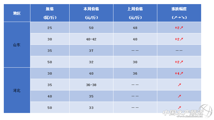 河北:今日蝦價30頭40元/斤,35頭36-38元/斤,40頭35元/斤,50頭33元/斤。對比上周,河北蝦價有所上漲,唐山、黃驊價格相差不大,30頭規格較多,存塘量較多,預計后市保持穩重有漲。