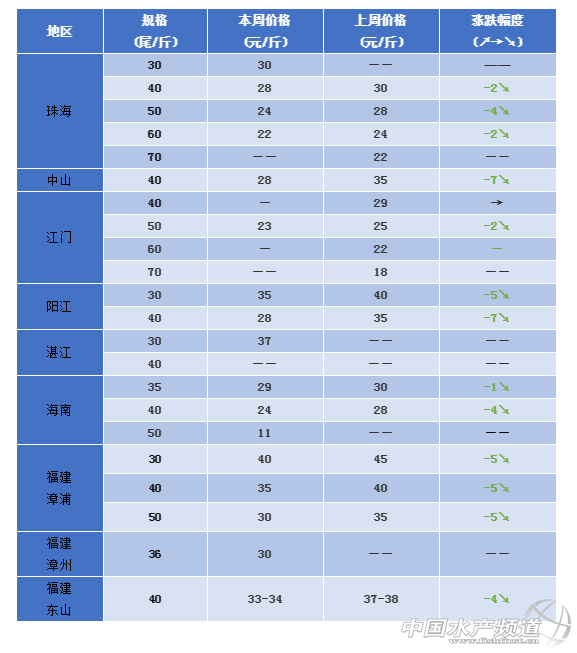 珠海:本周蝦價30頭30元/斤,40頭28元/斤,50頭24元/斤,60頭22元/斤。