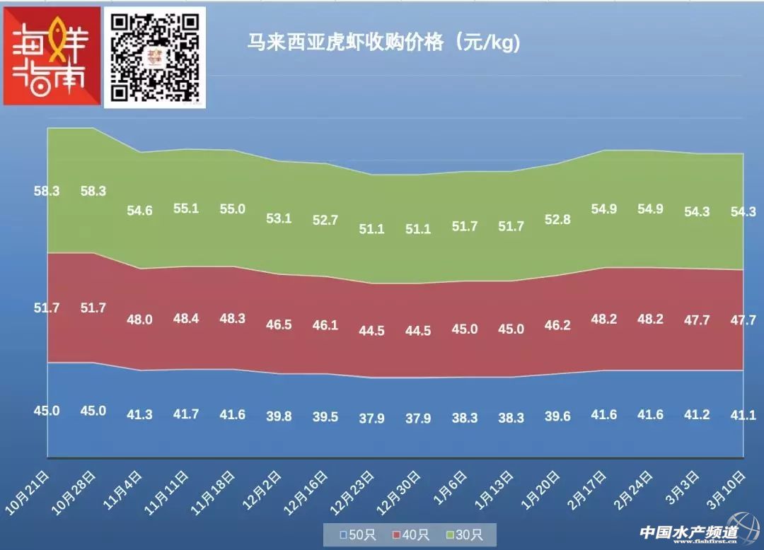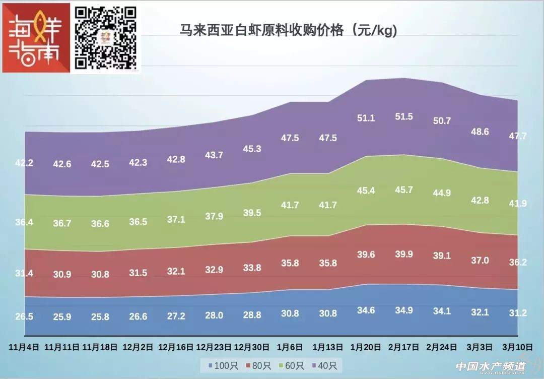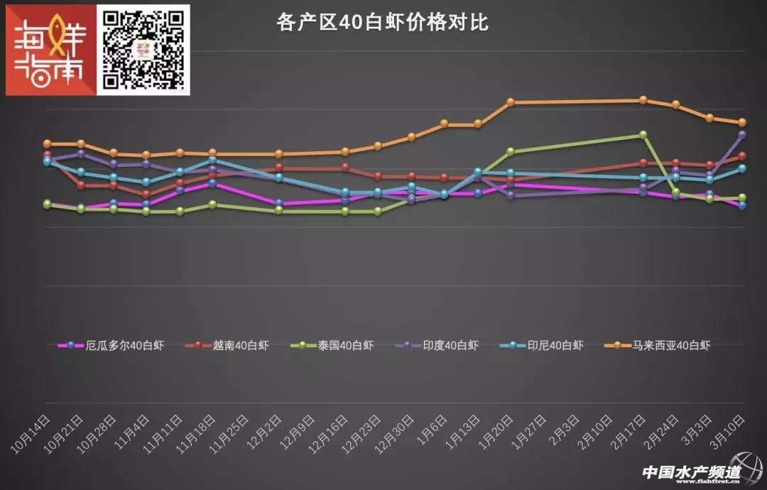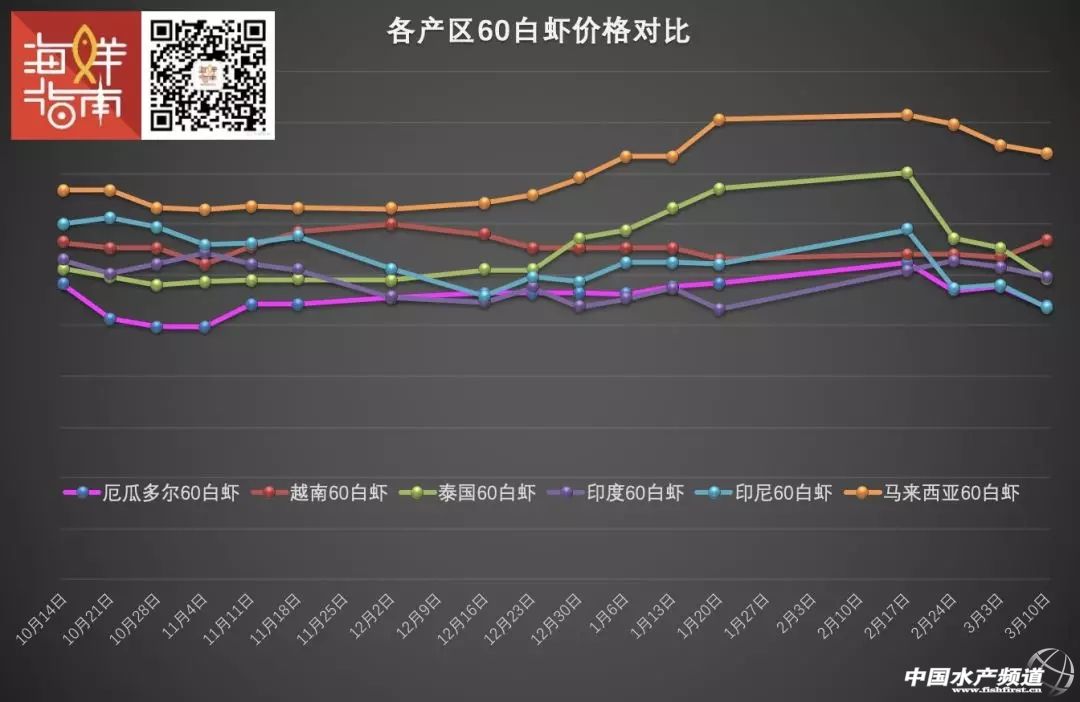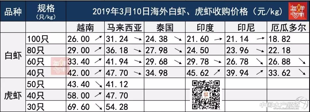 3月10日,僅越南60白蝦收購價保持上漲,其余產區均下滑(來源:海鮮指南)