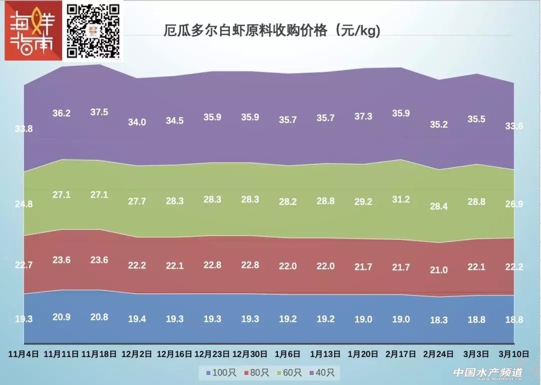 如下圖所示,3月10日,相較于一周前,厄瓜多爾白蝦收購價格出現下滑,60只/kg降幅為1.9元/kg、40只/kg降幅同樣為1.9元/kg。