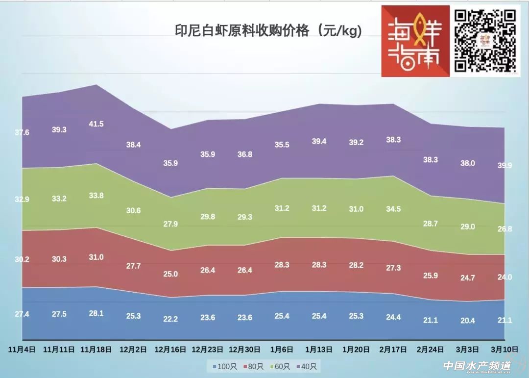 3月10日,從下圖可以看出,印尼白蝦收購價漲跌互現。其中,100只/kg原料蝦漲幅為0.7元/kg,80只/kg降幅為0.7元/kg,60只/kg降幅最大為2.2元/kg,但40只/kg漲幅為1.9元/kg。
