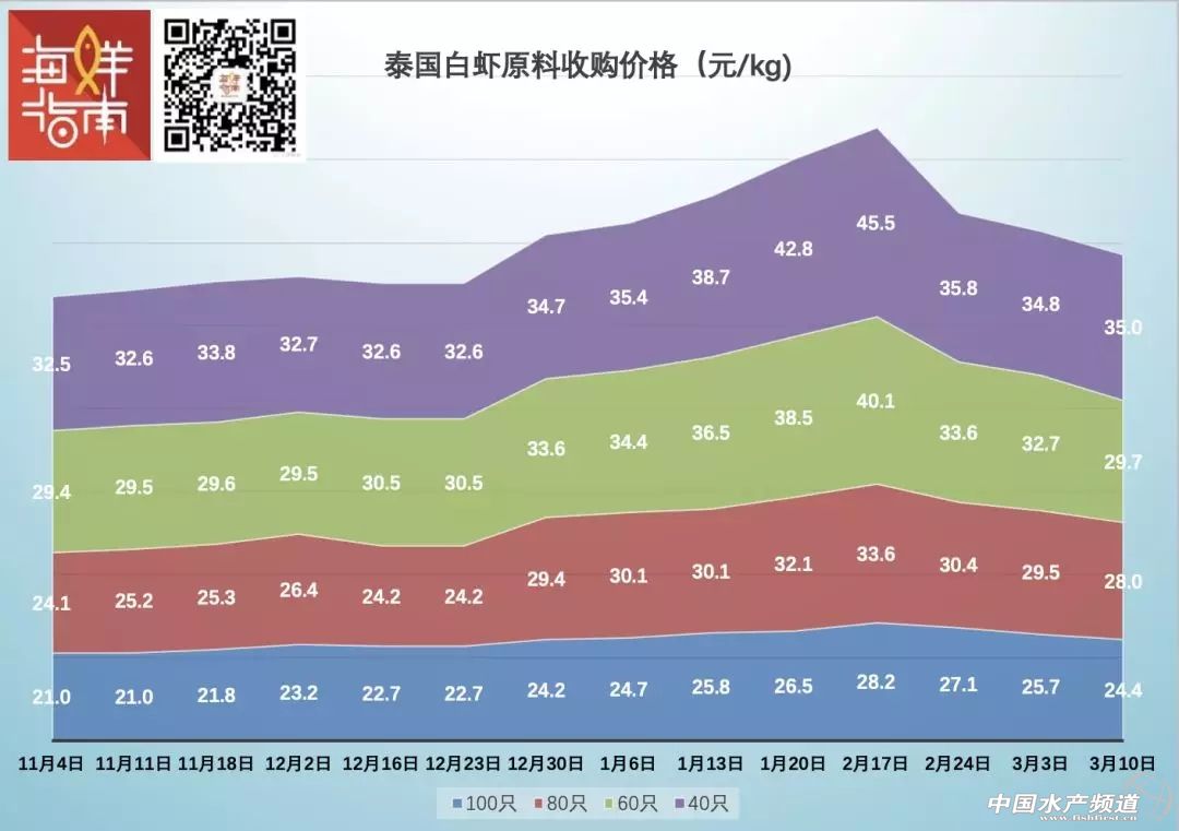 泰國白蝦原料收購價格走勢(來源:海鮮指南)