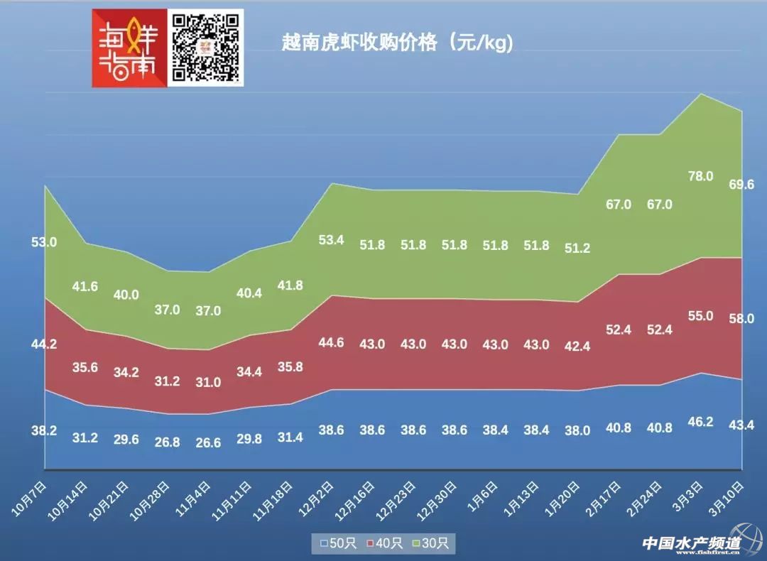 其中,30只/kg的越南虎蝦收購價跌回69.6元/kg,每公斤降幅達8.4元;40只/kg漲幅為3元/kg,50只/kg降幅為2.8元/kg。