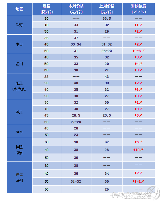 珠海:本周蝦價40條33元/斤,50條31元/斤。珠海地區對蝦存量已經非常少。
