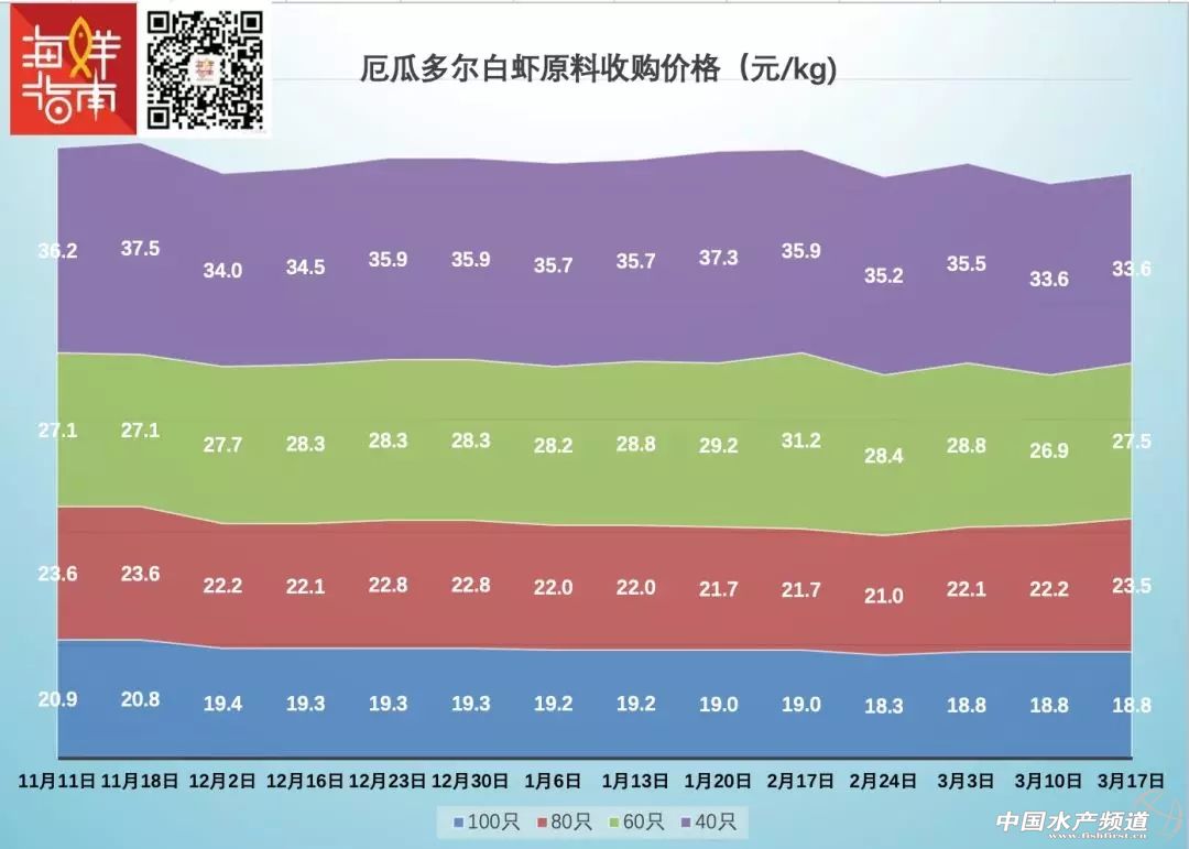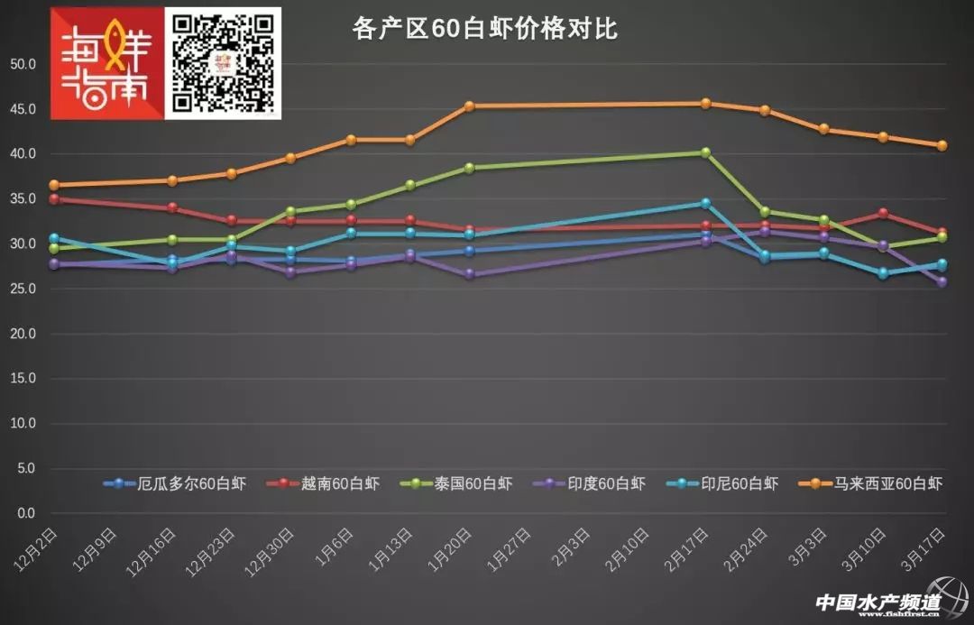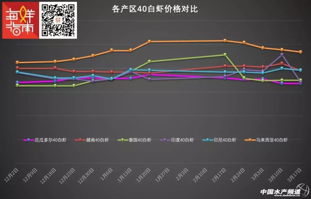 3月17日,厄瓜多爾、印尼、泰國60白蝦收購價保持上漲,其余產區下滑(來源:海鮮指南)