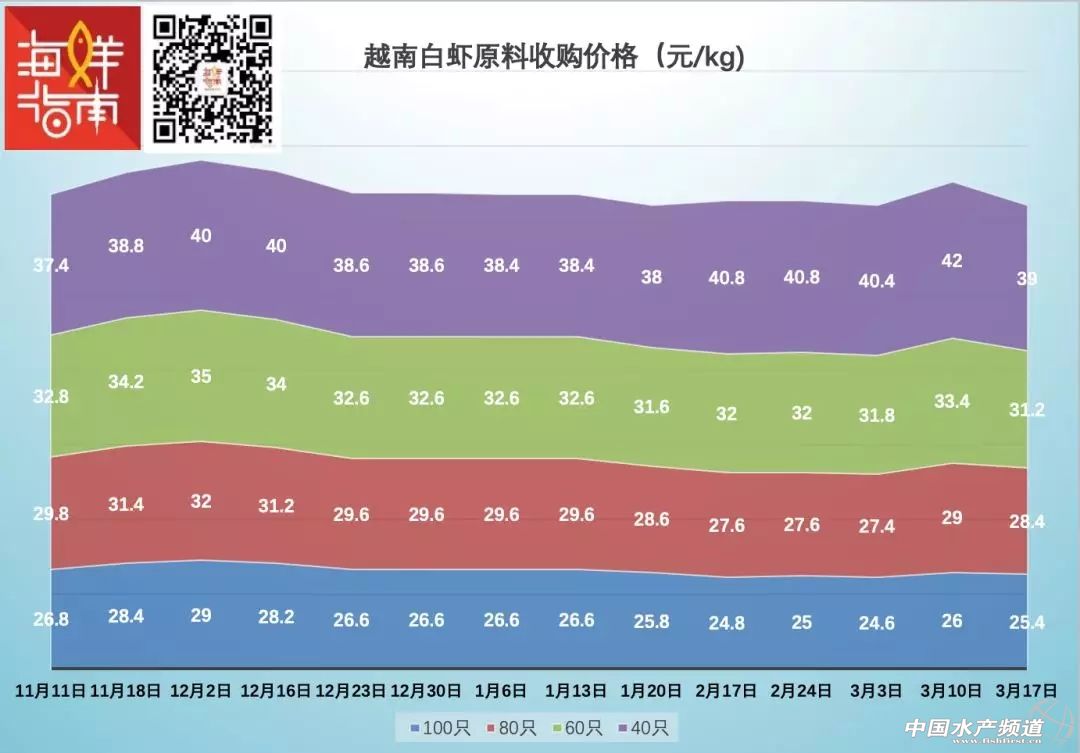 3月17日,相比一周前,越南白蝦收購價格全線下跌,其中,100只/kg原料蝦降幅為0.6元/kg,80只/kg降幅同樣為0.6元/kg,60只/kg降幅達2.2元/kg、40只/kg跌幅最大為3元/kg。